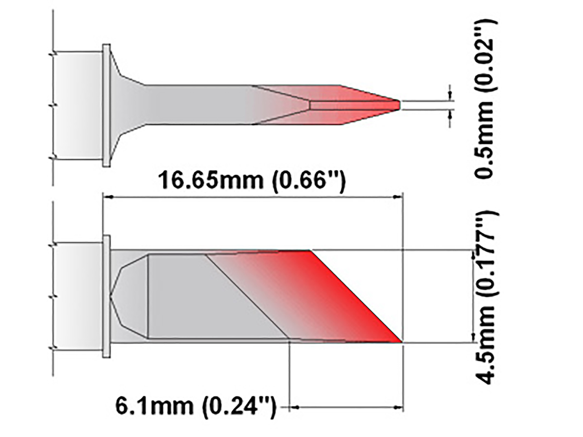 This is 4.5 mm 45° Knife Soldering Iron Tip for use with SP200 TMT-2000PS manufactured by Thermaltronics. The manufacturer part number is S75DS061. The tip is 4.5 mm in size. Its tip is of s series . Its tip is at 45° angle . The product is highly suitable for mfr-ps1100, mfr-ps2200, sp200, tmt-2000ps. The tip is designed with a straight knife shape.