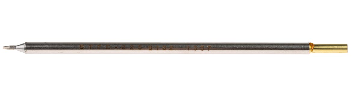 This is 1 mm 30° Straight Chisel Soldering Iron Tip manufactured by Metcal. The manufacturer part number is STTC-025. The tip is 1 mm in size. It has a model number sttc. Its tip is of sttc-0 series . Its tip is at 30° angle . The product is highly suitable for mx-h1-av, mx-rm3e. The tip is designed with a chisel shape.