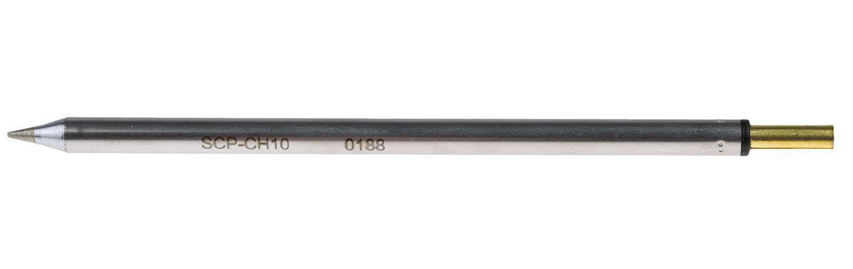 This is 1 mm 30° Straight Chisel Soldering Iron Tip manufactured by Metcal. The manufacturer part number is SCP-CH10. The tip is 1 mm in size. It has a model number sxp. Its tip is of scp series . Its tip is at 30° angle . The product is highly suitable for mfr-h1-sc2. The tip is designed with a chisel shape.