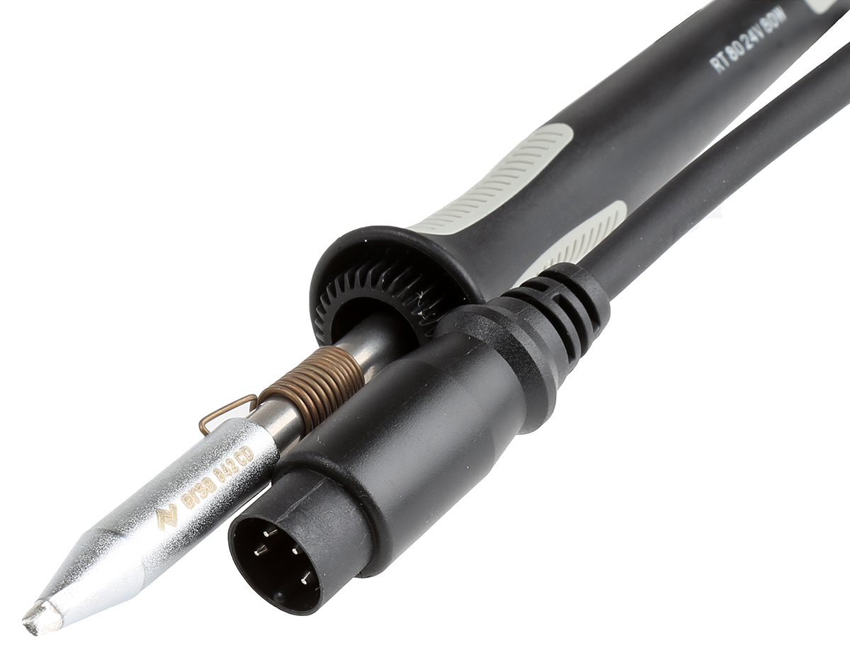 This is RT80 24V Electrical Soldering Iron 80W for use with RDS80 Station manufactured by Ersa. The manufacturer part number is 890CDJ. This product carries 80w. It supports electric type power . It has a model number rt80. Its tip is of 842 series . Its input voltage is 24v. The product is highly suitable for rds80 station. The soldering tip has 280°c temperature . It comes in soldering iron configuration.