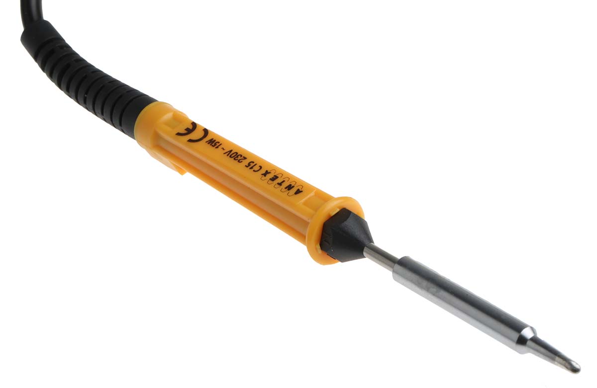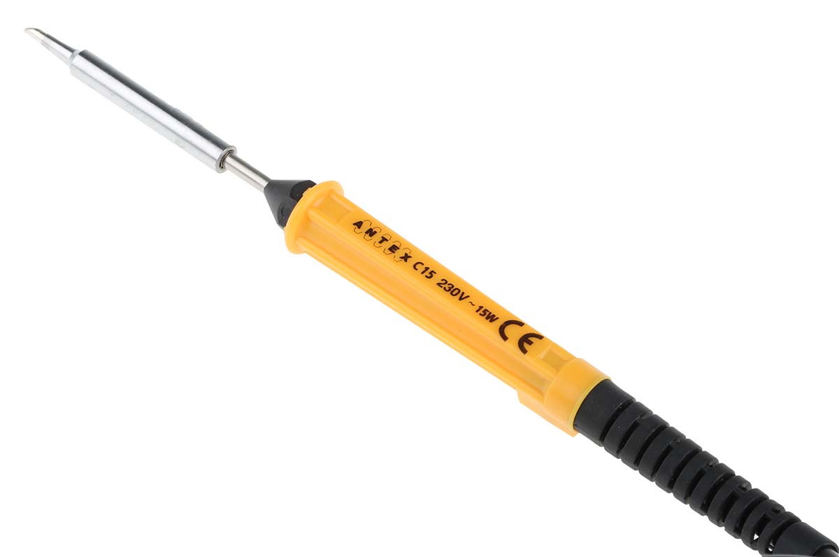 This is 230V ac Electrical Soldering Iron 15W UK Plug manufactured by Antex Electronics. The manufacturer part number is S272470. This product carries 15w. It supports electric type power . The plug is a highly reliable uk with long service life. Its tip is of mk2 series . Its input voltage is 230v. The soldering tip has 370°c temperature . It comes in soldering iron configuration.