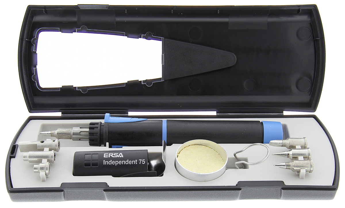 This is Independent 75 Soldering Iron Kit for use with Independent 75 Gas Soldering Iron manufactured by Ersa. The manufacturer part number is G07400141. Its tip is of 0g072an, 0g072be, 0g072cn, 0g072kn, 0g072re, 0g072vn, he0g072 series . The product is highly suitable for independent 75 gas soldering iron. It supports gas type power . It comes in soldering iron kit configuration. It has a model number independent 75.
