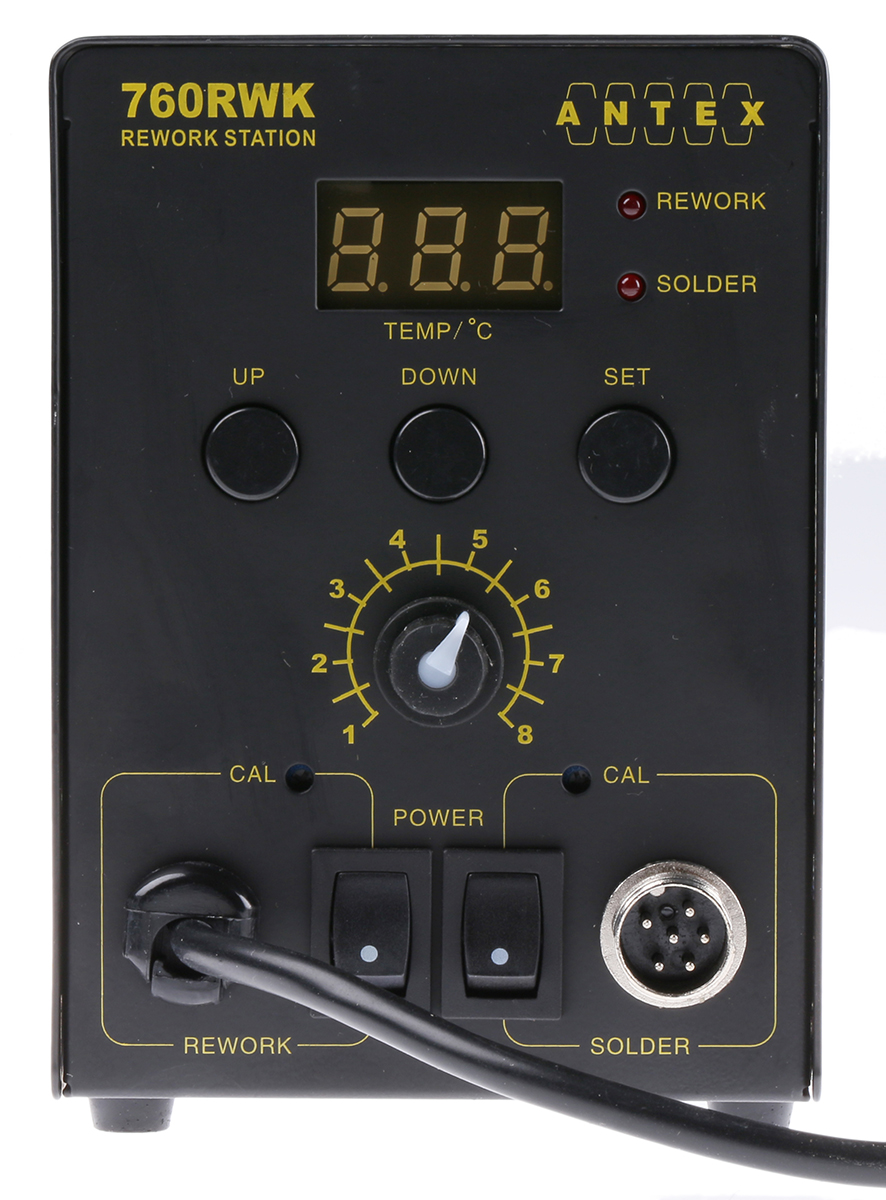 This is 760RWK Soldering Station 230V UK Plug manufactured by Antex Electronics. The manufacturer part number is UD82D70. Additionally, the product is supplied with 1 outputs. It features a remarkable lcd display. This product carries 50w. It is desoldering / hot air tasks supported . The plug is a highly reliable type g - british 3-pin with long service life. It has a model number 760rwk. Its input voltage is 230v. ESD Safety - yes. The soldering tip has 450°c temperature .