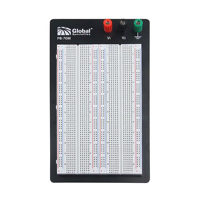 The PB-70M from Global Specialties is a solderless breadboard assembly mounted on a frame, measuring 8.46 inches long and 5.12 inches wide (215.0mm x 130.0mm). It provides a convenient platform for electronic prototyping and circuit construction without the need for soldering.