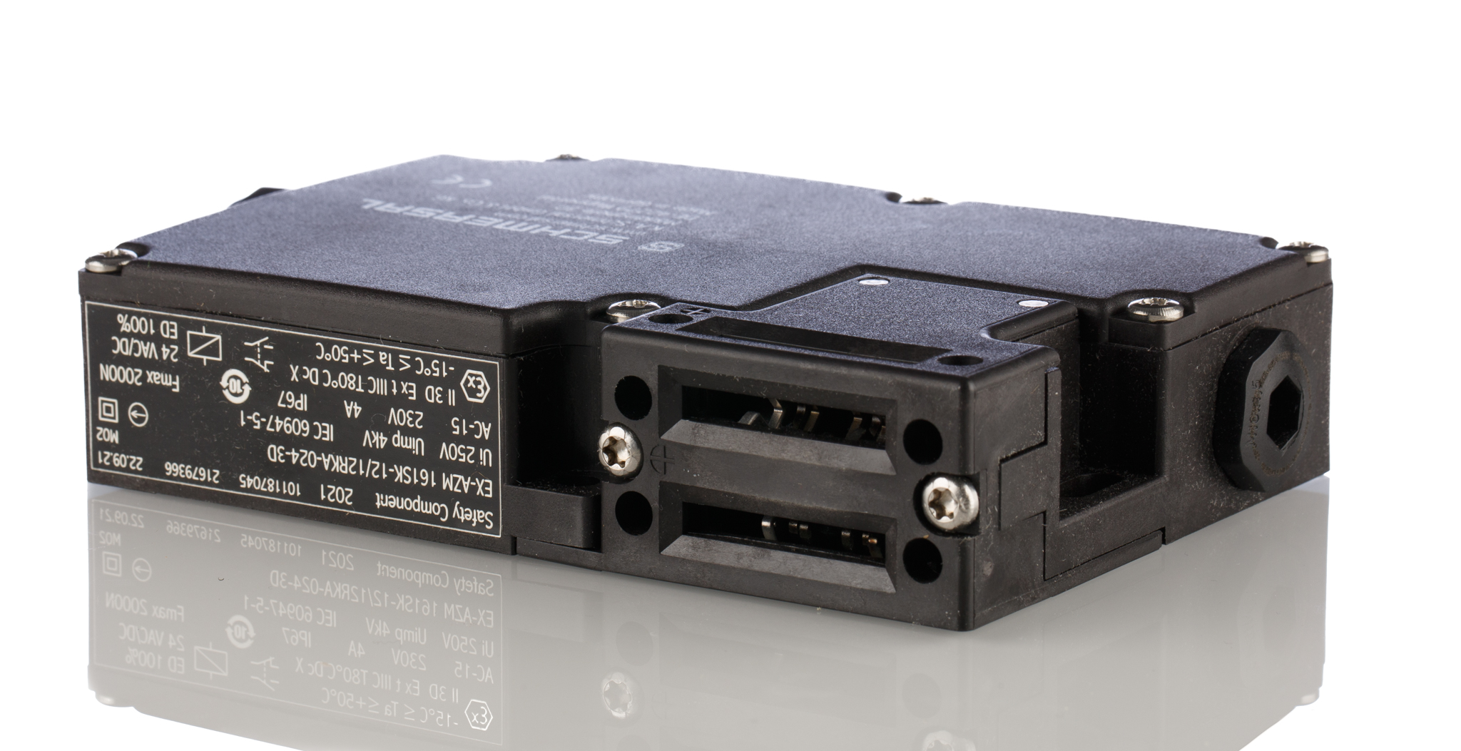 This is EX-AZM 161 Solenoid Interlock Switch Power to Lock 24 V ac/dc manufactured by Schmersal. The manufacturer part number is EX-AZM 161SK-12/12RKA-024-3D. It has 24v maximum DC voltage. A bespoke product carries 230v ac of maximum AC voltage. The product complies with all safety standards, such as ce listed, en iso 13849-1. It is IP rated with ip67. The product ex-azm 161, is a highly preferred choice for users. It has the power to lock . The normal state configuration includes 2nc. Its accurate length is 130mm. It includes an actuator no . The product also features robust plastic housing material. Furthermore, the product is 114mm wide. The product comes in 30mm depth. Its power consumption is approximately 10w . Features 24v ac/dc supply voltage. It includes 4 safety contacts . It has a standard m16 conduit entry . It has 1no/1nc high-quality auxiliary contact . The product is certified with atex hazardous area certification.