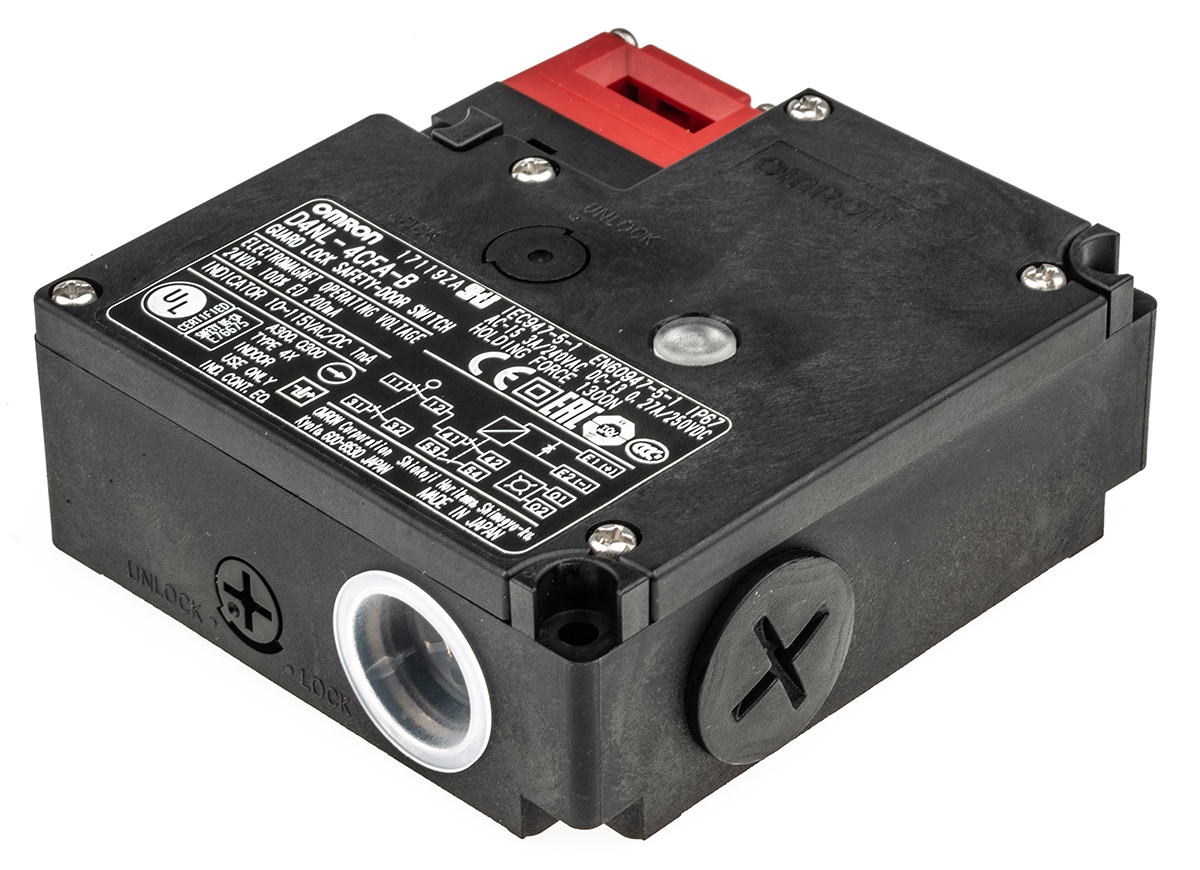 This is D4NL Solenoid Interlock Switch Power to Unlock 24 V dc manufactured by Omron. The manufacturer part number is D4NL-4CFA-B. The product complies with all safety standards, such as ce. It is IP rated with ip67. The product d4nl, is a highly preferred choice for users. It has the power to unlock . The normal state configuration includes 2nc + 1nc/1no. Its accurate length is 88.5mm. The product also features robust plastic housing material. Furthermore, the product is 95mm wide. The product comes in 35.5mm depth. Features 24v dc supply voltage. It includes 2nc safety contacts . It has a standard m20 conduit entry . It features d4nl range. It has 1no/1nc high-quality auxiliary contact .