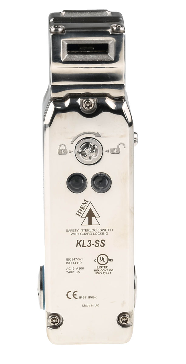 This is KL3-SS Solenoid Interlock Switch Power to Unlock 24 V ac/dc manufactured by IDEM. The manufacturer part number is 205001. It includes 4nc safety contacts . It is IP rated with ip67, ip69k. The product kl3-ss, is a highly preferred choice for users. It has the power to unlock . Its accurate length is 177mm. It includes an actuator no . The product also features robust stainless steel housing material. Furthermore, the product is 48mm wide. The product comes in 47mm depth. Features 24v ac/dc supply voltage. It has a standard m20 conduit entry . It features hygielock range. It has 1no high-quality auxiliary contact .