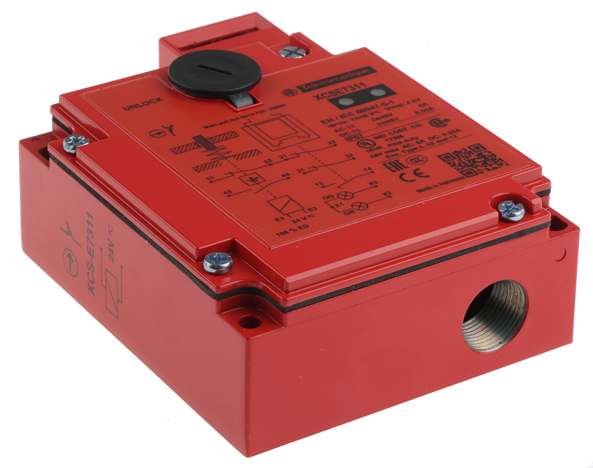 This is XCS-E Solenoid Interlock Switch Power to Unlock 24 V ac/dc manufactured by Telemecanique Sensors. The manufacturer part number is XCSE7311. The product carries key actuator. It is IP rated with ip67. The product xcs-e, is a highly preferred choice for users. It has the power to unlock . Its accurate length is 98mm. It includes an actuator yes . The product also features robust metal housing material. Furthermore, the product is 44mm wide. The product comes in 146mm depth. Features 24v ac/dc supply voltage. It has a standard pg13.5 conduit entry . It features preventa range. It includes no/2nc safety contacts .