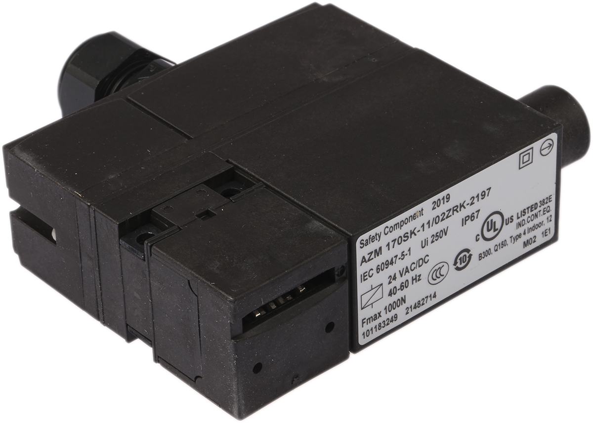 This is AZM 170 Solenoid Interlock Switch Power to Unlock 24 V ac/dc manufactured by Schmersal. The manufacturer part number is AZM 170SK-11/02ZRK-2197 24VAC/DC. It has 24v maximum DC voltage. A bespoke product carries 24v ac of maximum AC voltage. The normal state configuration includes 3nc. It is IP rated with ip67. The product azm 170, is a highly preferred choice for users. It has the power to unlock . Its accurate length is 30mm. It includes an actuator no . The product also features robust plastic housing material. Furthermore, the product is 108mm wide. The product comes in 100.5mm depth. Its power consumption is approximately 10w . Features 24v ac/dc supply voltage. It includes 3nc safety contacts . It has a standard 1/2 in npt conduit entry . It has 1no high-quality auxiliary contact .