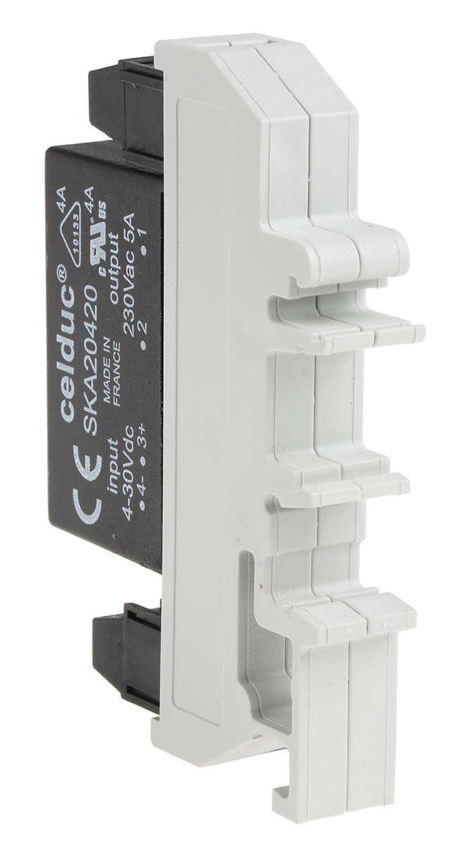 This is 4 A Solid State Relay Zero Crossing DIN Rail Triac 275 V rms Maximum Load manufactured by Celduc. The manufacturer part number is XKA20420. The given dimensions of the product include 76.4 x 17.2 x 53mm. It features xk range. While its maximum load voltage is 275 v rms. Its output device includes triac. Its load voltage range is about 12 → 275v . The product complies with all safety standards, such as ce, eac. Additionally, it has a minimum 6 v control voltage . Additionally, its off state leakage current is 0.3ma rms . The product has an assigned xka20420 manufacturer part number. It has a maximum operating temperature of +80°c. The terminal is a screw type. Moreover, it has a typical 6 → 30 v control voltage range . Whereas, the minimum operating temperature of the product is -40°c. The product has -40 → +80°c of operating temperature range. The product has a minimum 5 ma load current . Its accurate length is 76.4mm. The product has a maximum 10ms turn on time . The product also provides special features, such as control visualization by led.. This product uses zero cross switching mechanism. It carries 5 a maximum load current. The product is available in din rail configuration. The product xk, is a highly preferred choice for users. The product comes in 17.2mm depth. In addition, the height is 53mm. The product has a maximum 30 v control voltage . It has equipped with 1 poles.