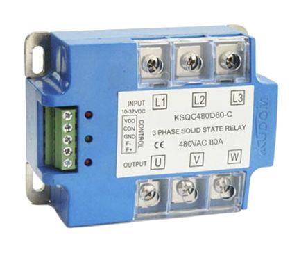 This is 80 A Solid State Relay Zero Cross Panel Mount SCR 530 V ac Maximum Load manufactured by Kudom. The manufacturer part number is KSQC480D80-C. The given dimensions of the product include 105 x 78 x 38mm. This is basically a three phase. While its maximum load voltage is 530 v ac. Its output device includes scr. Its load voltage range is about 48 530v ac . The product complies with all safety standards, such as ce. Additionally, it has a minimum 10 v dc control voltage . Additionally, its off state leakage current is 5 ma . This product uses zero cross switching mechanism. The terminal is a screw type. The product has -30 +80°c of operating temperature range. Moreover, it has a typical 10 32 v dc control voltage range . Its accurate length is 105mm. The product has a maximum 35 ms turn on time . The product also provides special features, such as fault indication function, internal rc/mov protection circuit, load disconnection detection function, over temperature protection, phase-lack detection function, scr failure detection function. It carries 80 a maximum load current. The product is available in panel mount configuration. The product comes in 78mm depth. In addition, the height is 38mm. The product has a maximum 32 v dc control voltage . It carries up to 48 v ac minimum load voltage.