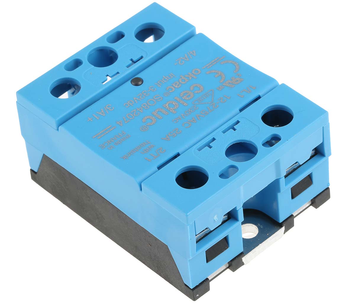 This is 25 A Solid State Relay Zero Crossing Chassis Mount Triac 275 V rms Maximum Load manufactured by Celduc. The manufacturer part number is SO842074. The given dimensions of the product include 58.5 x 45 x 30mm. This is basically a single phase solid state relay. It features okpac range. While its maximum load voltage is 275 v rms. Its output device includes triac. Its load voltage range is about 12 → 275v ac . The product complies with all safety standards, such as ce, vde, eac, curus. Additionally, it has a minimum 3 v dc control voltage . This product uses zero cross switching mechanism. It has a maximum operating temperature of +100°c. The terminal is a screw type. Moreover, it has a typical 3 → 32 v dc control voltage range . Whereas, the minimum operating temperature of the product is -55°c. The product has -55 → +100°c of operating temperature range. The product has a minimum 5 ma load current . Its accurate length is 58.5mm. The product has a maximum 10ms turn on time . It carries 25 a maximum load current. The product is available in panel mount configuration. The product so8, is a highly preferred choice for users. The product comes in 45mm depth. In addition, the height is 30mm. The product has a maximum 32 v control voltage . It has equipped with 1 poles. It carries up to 12 v ac minimum load voltage.