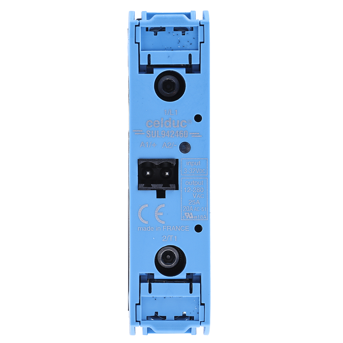 This is 25 A Solid State Relay Zero Cross DIN Rail Thyristor 280 V ac Maximum Load manufactured by Celduc. The manufacturer part number is SUL942460. The given dimensions of the product include 22.5 x 119.1 x 80mm. This is basically a ac. It features sul9 range. While its maximum load voltage is 280 v ac. Its output device includes triac. Its load voltage range is about 12 → 280v ac . The product complies with all safety standards, such as ce, vde, eac. Additionally, it has a minimum 3 v dc control voltage . Additionally, its off state leakage current is 1 ma . This product uses zero cross switching mechanism. It has a maximum operating temperature of +100°c. The terminal is a screw type. Moreover, it has a typical 3 → 32 v dc control voltage range . Whereas, the minimum operating temperature of the product is -55°c. The product has -55 → +100°c of operating temperature range. The product has a minimum 5 ma load current . Its accurate length is 22.5mm. The product has a maximum 10ms turn on time . The product also provides special features, such as zero cross solid state relay especially designed for resistive loads, yellow led visualization on the input, ip20 protection by removable flaps on terminals with optional labels. It carries 25 a maximum load current. The product is available in din rail configuration. The product sul9-sum9, is a highly preferred choice for users. The product comes in 119.1mm depth. In addition, the height is 80mm. The product has a maximum 32 v dc control voltage . It has equipped with 1 poles. It carries up to 12 v ac minimum load voltage.