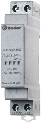 This is 5 A SPNO Solid State Relay Zero Crossing DIN Rail 265 V ac Maximum Load manufactured by Finder. The manufacturer part number is 77.01.8.230.8050. The given dimensions of the product include 17.5 x 60.8 x 84mm. While its maximum load voltage is 265 v ac. Its load voltage range is about 48 → 265v ac . Additionally, it has a minimum 110 v ac control voltage . Additionally, its off state leakage current is 3.5 ma . This product uses zero cross switching mechanism. It has a maximum operating temperature of +70°c. The terminal is a screw type. Moreover, it has a typical 110 → 240 v ac control voltage range . The product has -20 → +70°c of operating temperature range. The product has a minimum 100 ma load current . The contact is equipped with spst configuration. Its accurate length is 17.5mm. The product has a maximum 20ms turn on time . It carries 5 a maximum load current. The product is available in din rail configuration. The product 77, is a highly preferred choice for users. The product comes in 60.8mm depth. In addition, the height is 84mm. Whereas, the minimum operating temperature of the product is -20°c. The product has a maximum 240 v ac control voltage . It carries up to 48 v ac minimum load voltage.