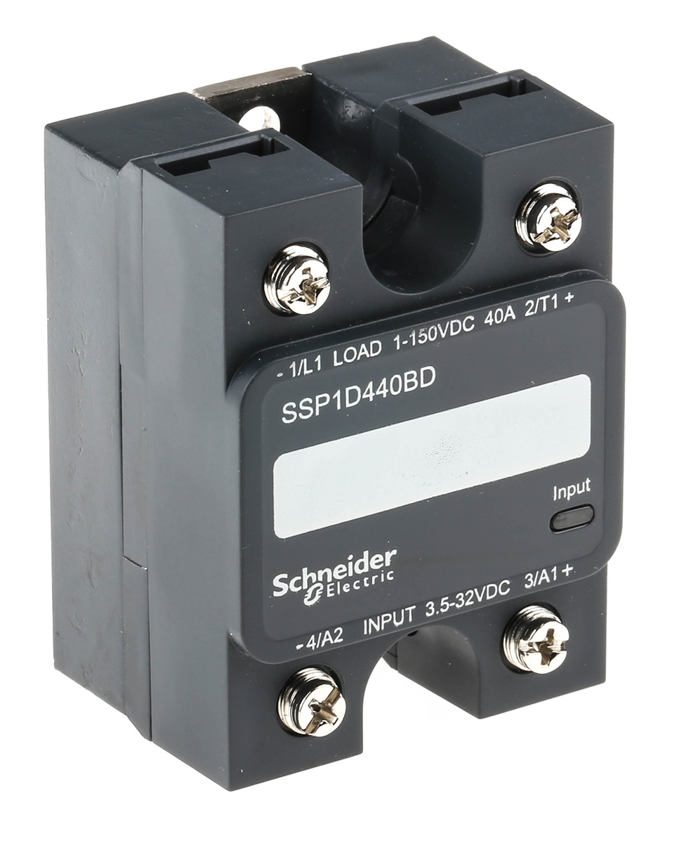 This is 40 A SPNO Solid State Relay DC Panel Mount MOSFET 150 V dc Maximum Load manufactured by Schneider Electric. The manufacturer part number is SSP1D440BD. The given dimensions of the product include 44.45 x 34.29 x 58.89mm. This is basically a solid state relay. It provides a 50pf of capacitance value. While its maximum load voltage is 150 v dc. Its output device includes mosfet. Its load voltage range is about 1 → 150v dc . The product complies with all safety standards, such as ce, csa, eac, en/iec, reach, ul. Additionally, it has a minimum 3.5 v dc control voltage . Additionally, its off state leakage current is <= 0.3 ma . This product uses dc switching mechanism. The terminal is a screw type. Moreover, it has a typical 3.5 → 32 v dc control voltage range . The product has -40 → +80°c of operating temperature range. The product has a minimum 0 a load current . The contact is equipped with spst configuration. Its accurate length is 44.5mm. The product has a maximum 0.1ms turn on time . The product also provides special features, such as green led for input visualization. It carries 40 a maximum load current. Better World Verification Options - green premium. Is it a better world product? yes. The product is available in panel mount configuration. The product harmony relay, is a highly preferred choice for users. The product comes in 34.3mm depth. In addition, the height is 58.9mm. The product has a maximum 32 v dc control voltage . It has equipped with 1 poles. It carries up to 1 v dc minimum load voltage.