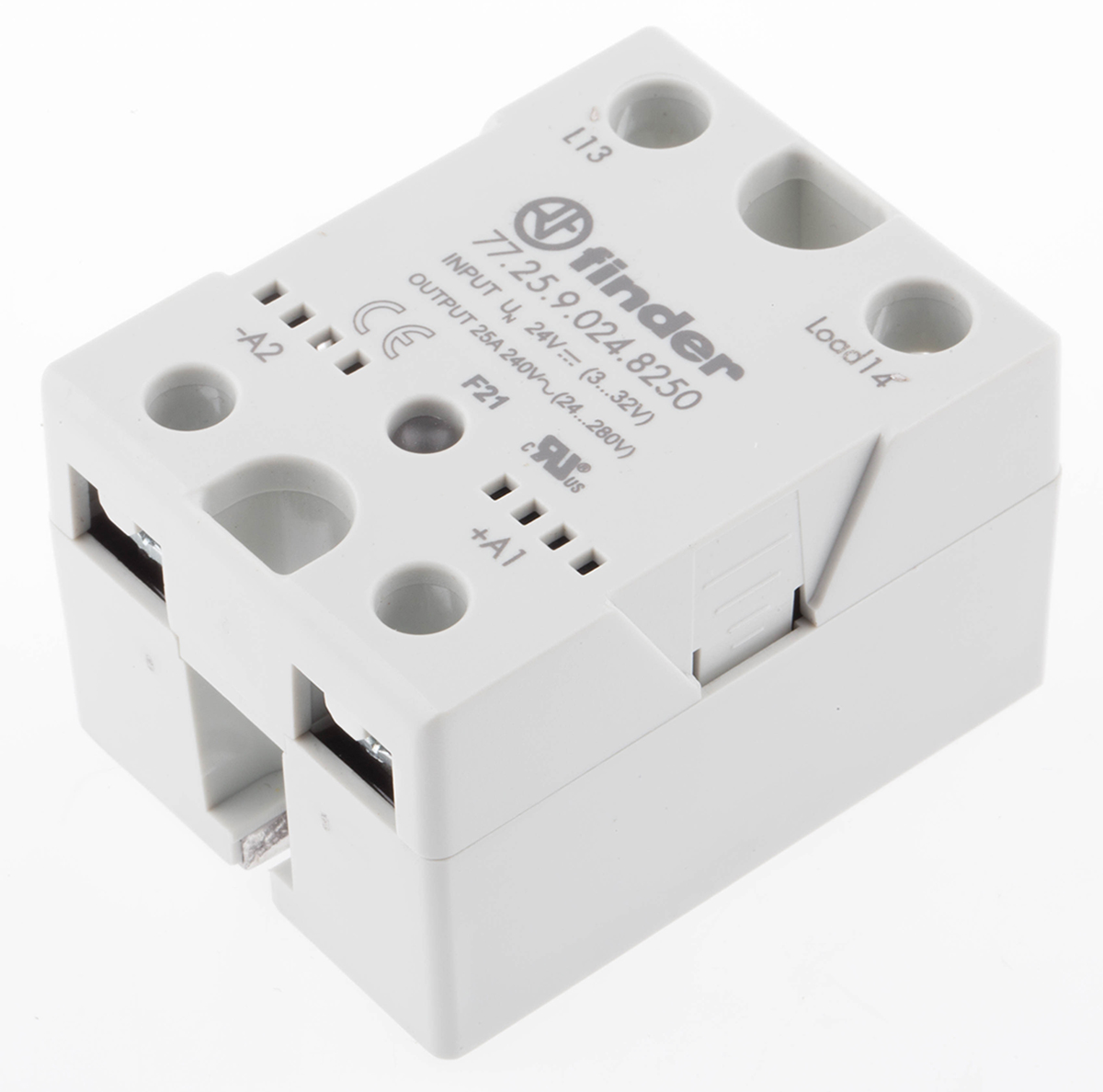 This is 25 A SPNO Solid State Relay Zero Crossing Heatsink 280 V ac Maximum Load manufactured by Finder. The manufacturer part number is 77.25.9.024.8250. While its maximum load voltage is 280 v ac. It carries 25 a maximum load current. Its load voltage range is about 21.6 → 280v ac . The given dimensions of the product include 44.5 x 36.4 x 57.7mm. The product is available in heatsink configuration. The product has -30 → +80°c of operating temperature range. The product 77, is a highly preferred choice for users. Its package is of hockey puck style . The product has a minimum 120 ma load current . Its accurate length is 57.7mm. In addition, the height is 36.4mm. Additionally, its off state leakage current is 10 ma . The product comes in 44.5mm depth. The product has a maximum 10ms turn on time . It carries up to 21.6 v ac minimum load voltage. The product has a maximum 24 v dc control voltage . Moreover, it has a typical 3<arrow/>32 v dc control voltage range . This product uses zero cross switching mechanism. The contact is equipped with spst configuration. The terminal is a screw type.