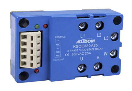 This is 25 A Solid State Relay Zero Cross Panel Mount 440 V ac Maximum Load manufactured by Kudom. The manufacturer part number is KSQE380A25. The given dimensions of the product include 80 x 50 x 30mm. This is basically a three phase. While its maximum load voltage is 440 v ac. Its load voltage range is about 48 440v ac . The product complies with all safety standards, such as ce. Additionally, it has a minimum 90 v ac control voltage . Additionally, its off state leakage current is 5 ma . This product uses zero cross switching mechanism. The terminal is a screw type. Moreover, it has a typical 90 280 v ac control voltage range . The product has -30 +80°c of operating temperature range. The product has a minimum 100 ma load current . Its accurate length is 80mm. The product has a maximum 1 (+1/2 cycle) ms turn on time . The product also provides special features, such as internal mov/rc protection circuit. It carries 25 a maximum load current. The product is available in panel mount configuration. The product comes in 50mm depth. In addition, the height is 30mm. The product has a maximum 280 v ac control voltage . It carries up to 48 v ac minimum load voltage.