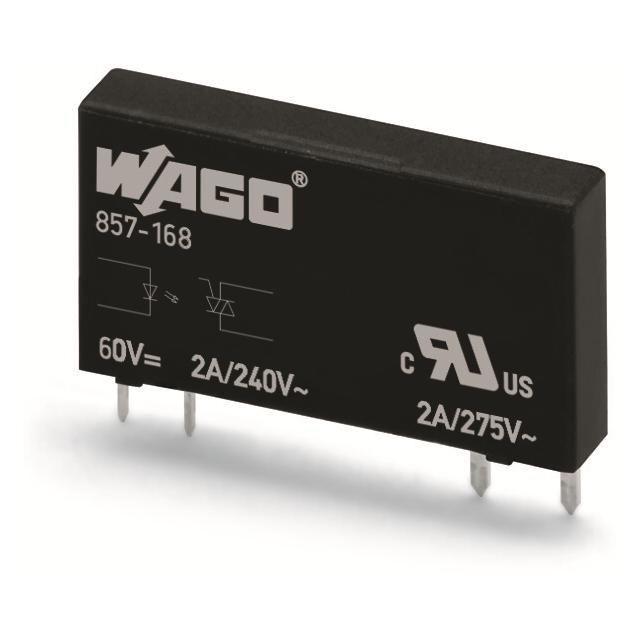 This is manufactured by WAGO Corporation. The manufacturer part number is 857-168. It is assigned with possible HTSUS value of 8536.41.0030. The product is rohs3 compliant. Moreover, it has pc pin terminal style. Moreover, the product comes in 4-sip. The possible product's input voltage is 60vdc. It has a typical 2 a load current. Furthermore, it has aac, zero cross output. It is shipped in box package . Its typical moisture sensitivity level is not applicable. It has an integral spst-no (1 form a) circuit. It has a long 12 weeks standard lead time. The product is available in through hole configuration. The product 857, is a highly preferred choice for users. The given load voltage is 24 v ~ 240 v. 4-sip is the supplier device package value. The product is designated with the ear99 code number.