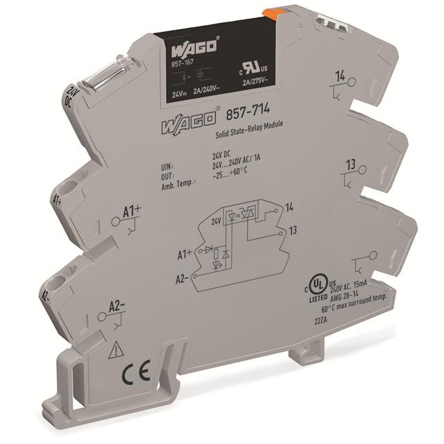 This is manufactured by WAGO Corporation. The manufacturer part number is 857-714. It is assigned with possible HTSUS value of 8536.41.0030. The product is rohs3 compliant. Moreover, it has spring terminal terminal style. Moreover, the product comes in module. The possible product's input voltage is 24vdc. It has a typical 2 a load current. Furthermore, it has aac, zero cross output. Its typical moisture sensitivity level is not applicable. It has an integral spst-no (1 form a) circuit. It has a long 12 weeks standard lead time. The product is available in din rail configuration. The product 857, is a highly preferred choice for users. The given load voltage is 24 v ~ 240 v. In addition, box is the available packaging type of the product. The product is designated with the ear99 code number.