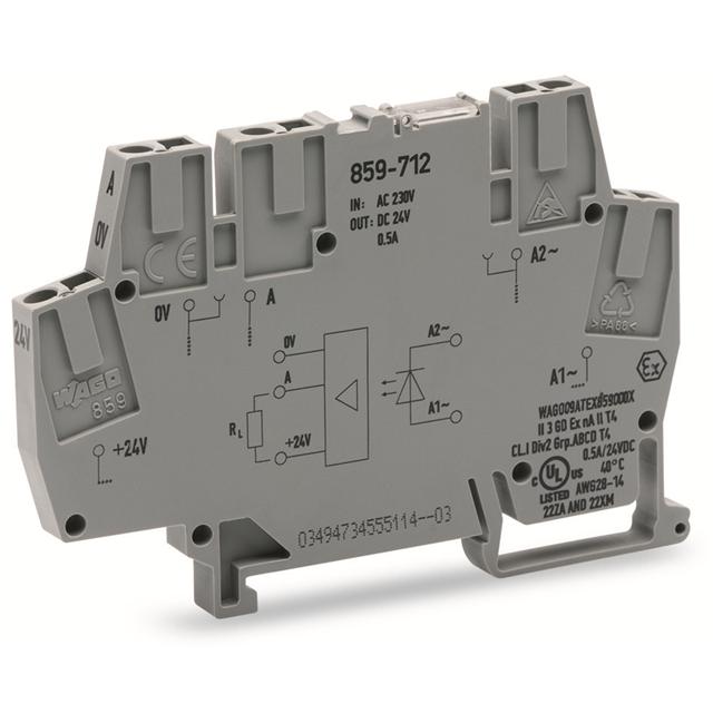 This is manufactured by WAGO Corporation. The manufacturer part number is 859-712. It is assigned with possible HTSUS value of 8536.41.0030. The product is rohs3 compliant. Moreover, it has spring terminal terminal style. The product has -25°c ~ 55°c operating temperature range. It is approved by eac, ul. Moreover, the product comes in module. The possible product's input voltage is 230vac. It has a typical 500 ma load current. Furthermore, it has adc output. Its typical moisture sensitivity level is not applicable. It has an integral spst-no (1 form a) circuit. It has a long 12 weeks standard lead time. The product is available in din rail configuration. The product 859, is a highly preferred choice for users. The given load voltage is 20 v ~ 30 v. In addition, box is the available packaging type of the product. The product is designated with the ear99 code number.