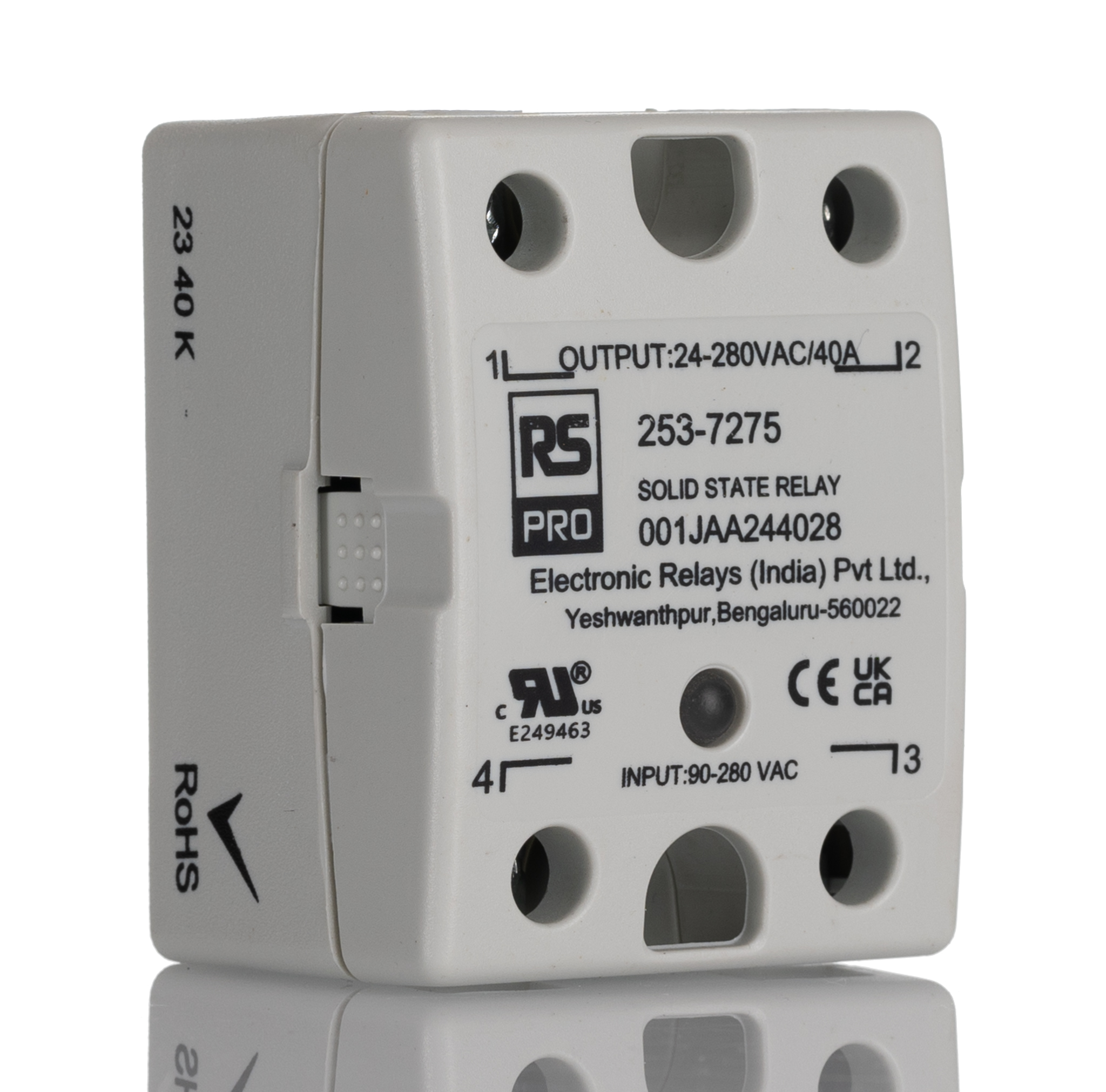 This is Solid State Relay 40 Amps Load Panel Mount Surface Mount 280 Vrms Load manufactured by RS PRO. The manufacturer part number is 253-7275. While its maximum load voltage is 280 vrms. It carries 40 amps maximum load current. Its output device includes triac. The product is available in panel mount, surface mount configuration. The product has a minimum 80 ma rms load current . The contact is equipped with spst configuration. It carries up to 24 vrms minimum load voltage. This product uses zero cross switching mechanism.
