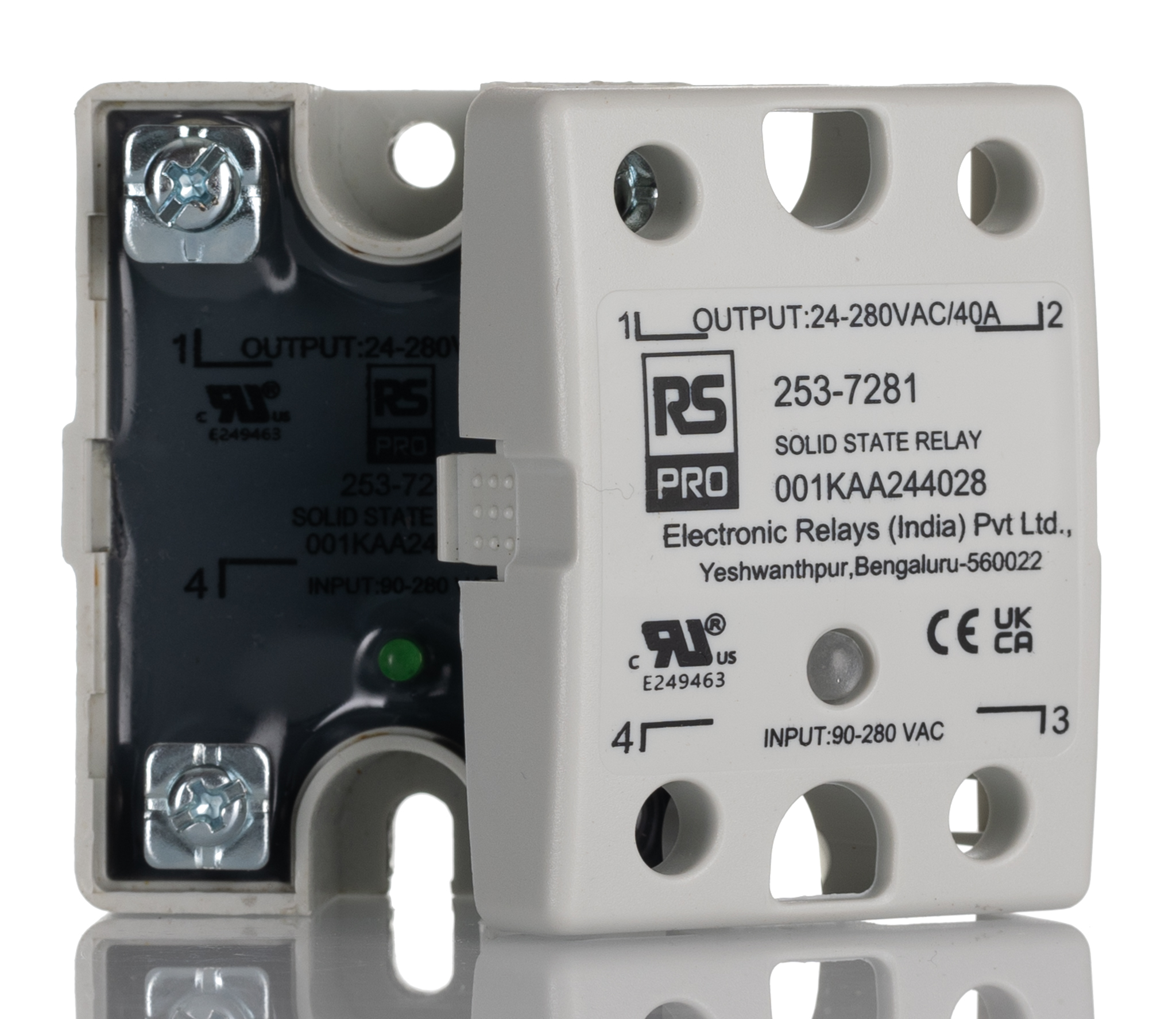 This is Solid State Relay 40 Amps Load Panel Mount Surface Mount 280 Vrms Load manufactured by RS PRO. The manufacturer part number is 253-7281. While its maximum load voltage is 280 vrms. It carries 40 amps maximum load current. Its output device includes triac. The product is available in panel mount, surface mount configuration. The product has a minimum 80 ma rms load current . The contact is equipped with spst configuration. It carries up to 24 vrms minimum load voltage. This product uses zero cross switching mechanism.