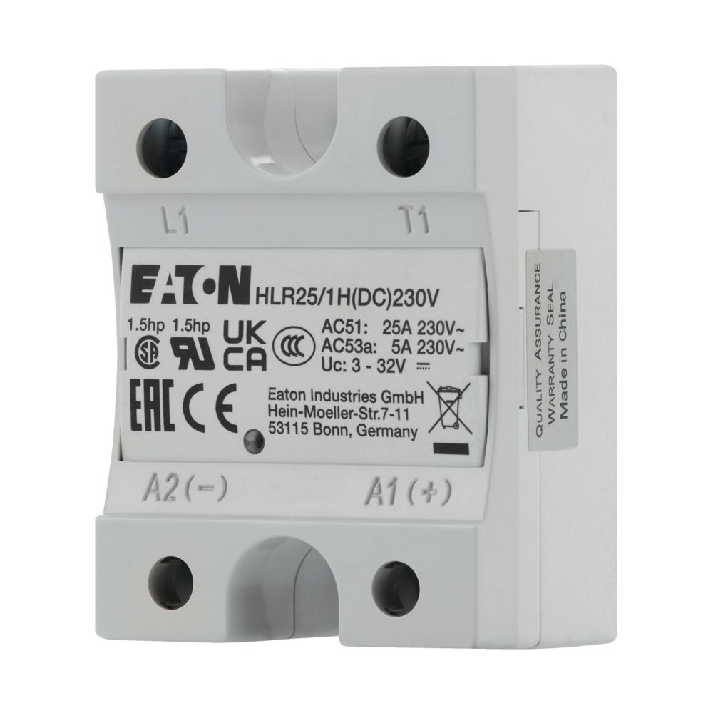 This is HLR Series Solid State Relay 25 A Load Chassis Mount 265 V ac Load 32 V dc Control manufactured by Eaton. The manufacturer part number is 360050 HLR25/1H(DC)230V. While its maximum load voltage is 265 v ac. It carries 25 a maximum load current. Additionally, it has a minimum 3 v dc control voltage . The product is available in chassis mount configuration. The product hlr, is a highly preferred choice for users. The product has a maximum 32 v dc control voltage . It carries up to 24 v ac minimum load voltage.