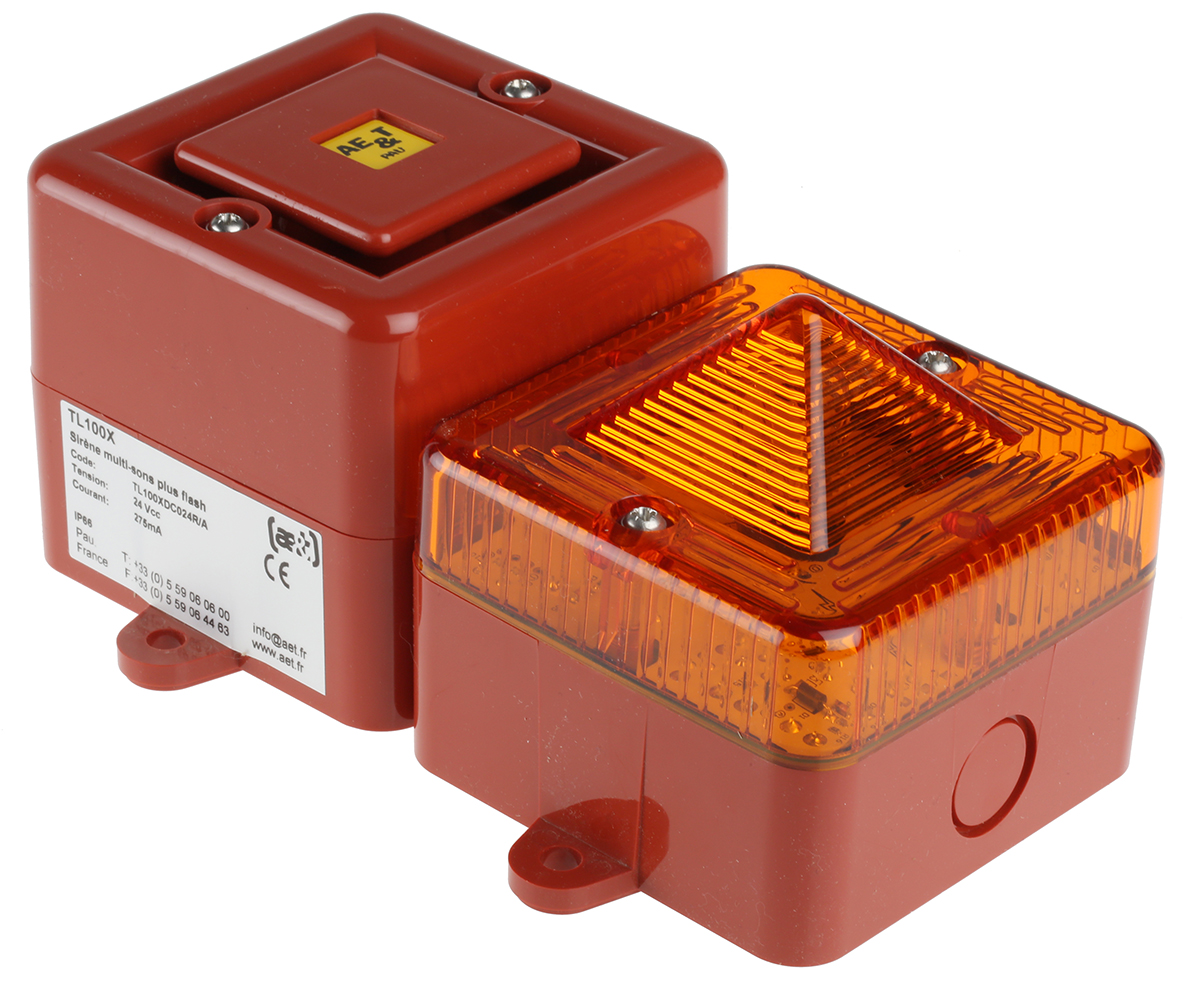 This is TL100 Sounder Beacon Orange Xenon 24 V dc manufactured by AE & T. The manufacturer part number is TL100 24VCC ORANGE. In addition, it has a/an siren type sounder . The housing has an adorable red colour. The lens has an adorable amber colour. The product also features robust abs housing material. The product is integrated with a xenon bulb. It is IP rated with ip67. The product tl100x, is a highly preferred choice for users. It has a minimum 90db decibel . It contains 104db decibels at 1 meter . The product is available in wall mount style. This product harbours dc current. The product has +55°c maximum temperature. Features 20 → 28 v dc supply voltage. It has 32 tones . While its minimum temperature is -25°c. The product provides a strobe lighting effect. It has 104db maximum decibels .
