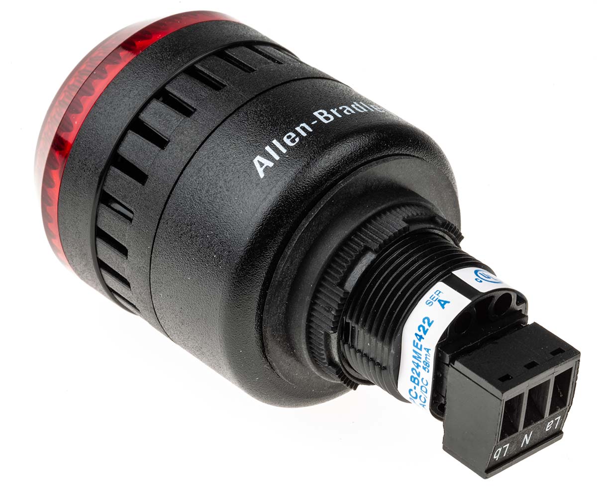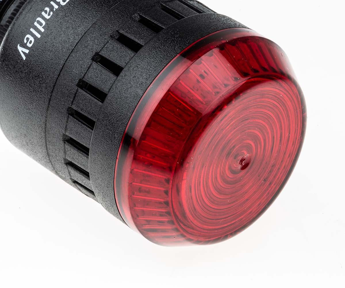 This is 855PC Sounder Beacon 98dB Red LED 24 V ac/dc manufactured by Allen Bradley. The manufacturer part number is 855PC-B24ME422. In addition, it has a/an electronic type sounder . The housing has an adorable black colour. The lens has an adorable red colour. The product also features robust polycarbonate housing material. The product is integrated with a led bulb. It is IP rated with ip65. The product 855pc, is a highly preferred choice for users. It has a minimum 85db decibel . It contains 98db decibels at 1 meter . The product is available in panel mount style. This product harbours ac, dc current. The product has +60°c maximum temperature. Features 24 v ac/dc supply voltage. While its minimum temperature is -25°c. The product provides a flashing, steady lighting effect. It has 98db maximum decibels .