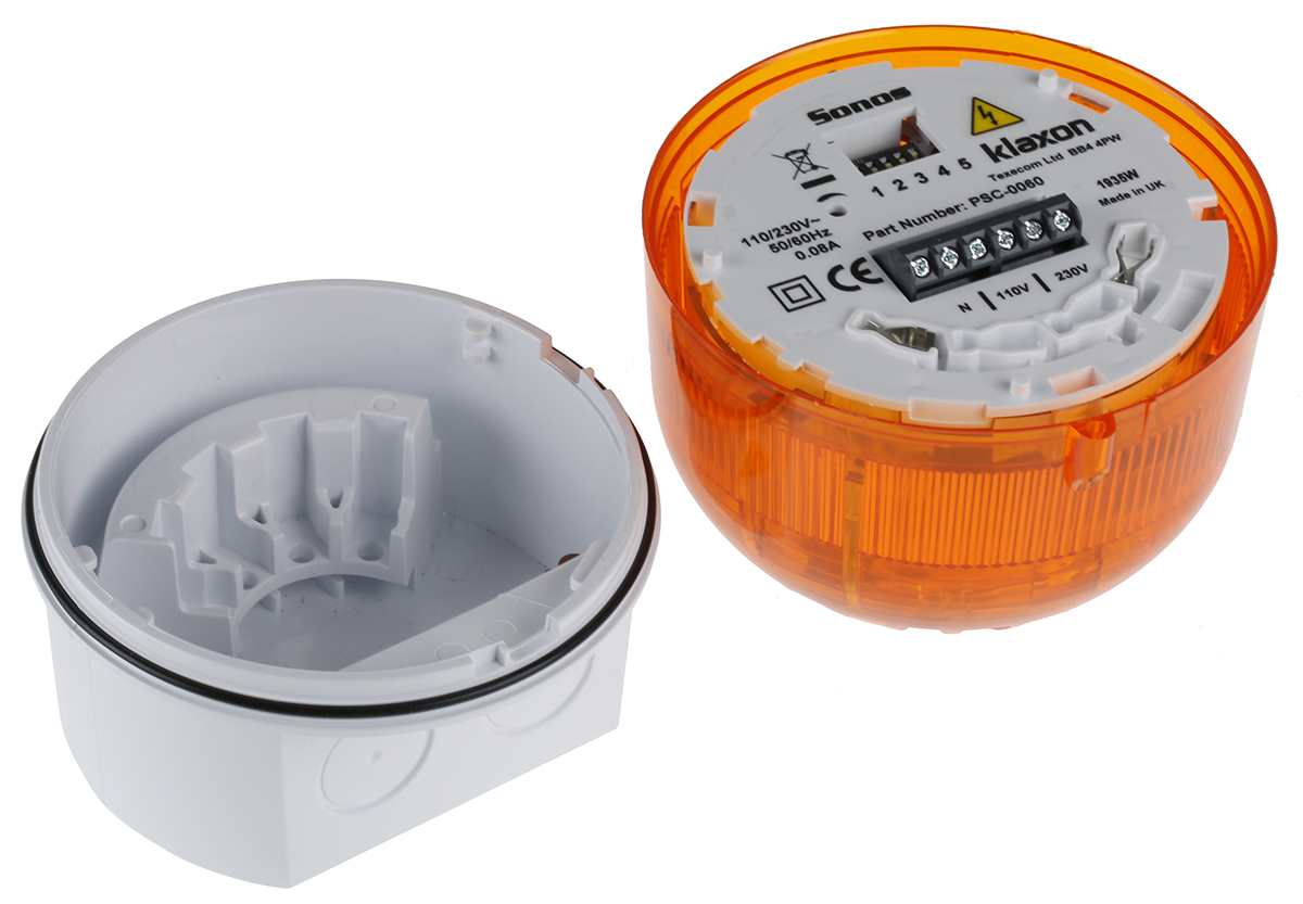 This is Sounder Beacon 20dB 110/230 V ac manufactured by Klaxon. The manufacturer part number is PSC-0060. In addition, it has a/an alarm type sounder . The housing has an adorable red colour. The product has +55°c maximum temperature. The product complies with all safety standards, such as en60950. The product also features robust polycarbonate housing material. It is IP rated with ip65. While its minimum temperature is -25°c. It contains 102db decibels at 1 meter . The product is available in base mount style. This product harbours dc current. Features 110 → 230 v ac supply voltage. It has 32 tones . It has 20db maximum decibels .