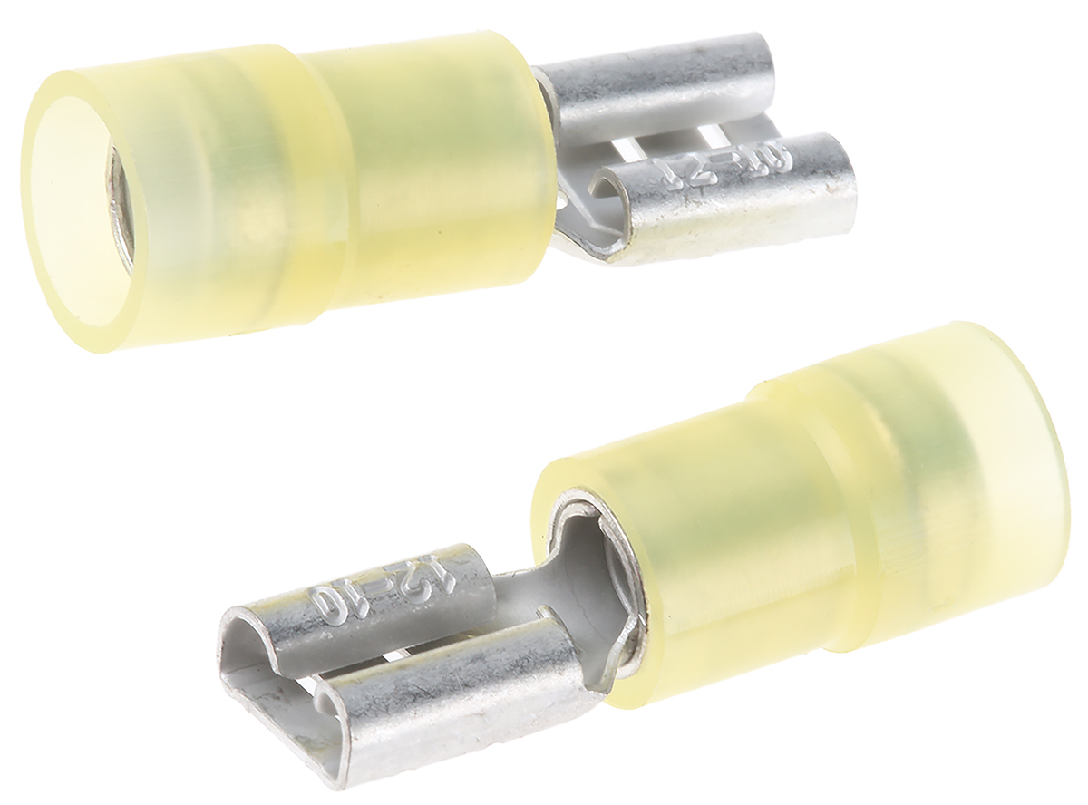 This is FDNYD5 Series Yellow Insulated Crimp Receptacle 6.35 x 0.8mm 4mm² to 6mm² 12AWG to 10AWG Copper Plated manufactured by RS Pro. The manufacturer part number is 267-4158. The wire has a maximum size of 6mm². In addition, female is the available "Gender" of the product. It has a decent yellow colour. While the minimum wire size AWG includes 12awg. Its tab size is about 6.35 x 0.8mm . It has a robust nylon insulation material. The high-quality tin is used as contact plating material. Insulation Option: insulated. Its maximum wires size includes 10awg. On the other hand, the wire has 4mm² of minimum size. The product is made from sturdy brass materials.