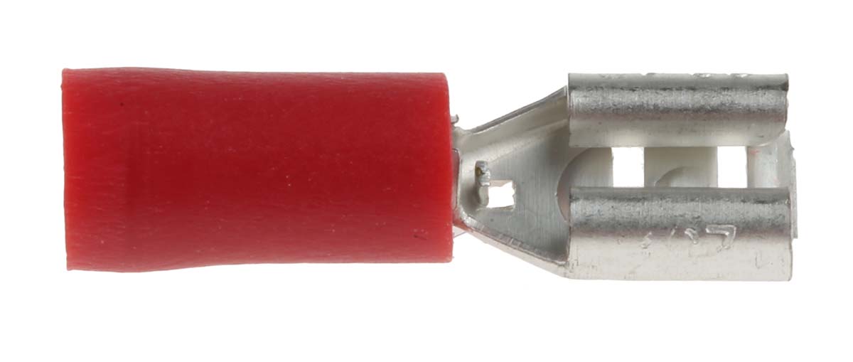 This is 36 Series Red Insulated Crimp Receptacle 4.8 x 0.8mm 0.5mm² to 1.5mm² 22AWG to 16AWG Tin Plated manufactured by RS Pro. The manufacturer part number is 534-395. The wire has a maximum size of 1.5mm². In addition, female is the available "Gender" of the product. It has a decent red colour. It allows crimp termination method. While the minimum wire size AWG includes 22awg. Its tab size is about 4.8 x 0.8mm . It has a robust vinyl insulation material. The high-quality tin is used as contact plating material. It has an overall length of 19mm. Insulation Option: insulated. Its maximum wires size includes 16awg. On the other hand, the wire has 0.5mm² of minimum size. It comes in receptacle configuration. The product is made from sturdy brass materials.