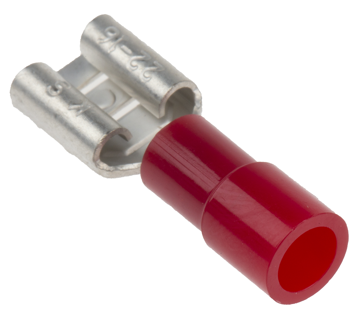This is FDNI1 Series Red Insulated Crimp Receptacle 6.35 x 0.8mm 0.5mm² to 1.5mm² 22AWG to 16AWG manufactured by RS Pro. The manufacturer part number is 613-9839. The wire has a maximum size of 1.5mm². In addition, female is the available "Gender" of the product. It has a decent red colour. It has an overall length of 21.5mm. While the minimum wire size AWG includes 22awg. It allows crimp termination method. Its tab size is about 6.35 x 0.8mm . It has a robust polycarbonate insulation material. The product fdni1, is a highly preferred choice for users. Insulation Option: insulated. Its maximum wires size includes 16awg. On the other hand, the wire has 0.5mm² of minimum size. It comes in receptacle configuration. The product is made from sturdy brass materials.