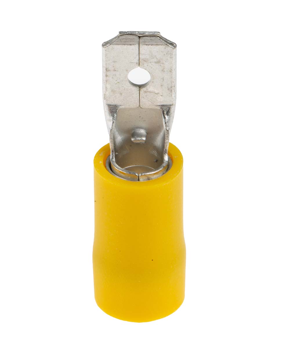 This is Yellow Insulated Crimp Tab Terminal 2.5mm² to 6mm² 12AWG to 10AWG 6.35 x 0.8mm Tin Plated manufactured by RS Pro. The manufacturer part number is 534-547. It is supplied as unshrouded. The bespoke tab is 0.8mm thick. The tab is 6.35mm wide. The wire has a maximum size of 6mm². In addition, male is the available "Gender" of the product. It has a decent yellow colour. It allows crimp termination method. While the minimum wire size AWG includes 12awg. Its tab size is about 6.35 x 0.8mm . The high-quality tin is used as contact plating material. It has an overall length of 25mm. Insulation Option: insulated. Its maximum wires size includes 10awg. On the other hand, the wire has 2.5mm² of minimum size. It comes in tab configuration. It has a robust vinyl insulation material. The product is made from sturdy brass materials.