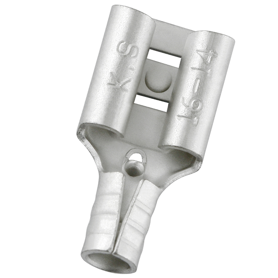 This is Crimp Quick Disconnect Terminal 0.8 x 6.35mm Tab Size 1.5 → 2.5 mm² 16 → 14 AWG Wire Size manufactured by RS PRO. The manufacturer part number is 178-8318. The bespoke tab is 0.8mm thick. On the other hand, the wire has 1.5mm² of minimum size. The tab is 6.35mm wide. The wire has a maximum size of 2.5mm². In addition, female is the available "Gender" of the product. It allows crimp termination method. While the minimum wire size AWG includes 16awg. Its tab size is about 0.8 x 6.35mm . The high-quality tin is used as contact plating material. It has an overall length of 15.2mm. Its maximum wires size includes 14awg. Concerning wire's size, it is 1.5 → 2.5 mm², 16 → 14 awg. It comes in receptacle configuration. The product is made from sturdy brass materials.