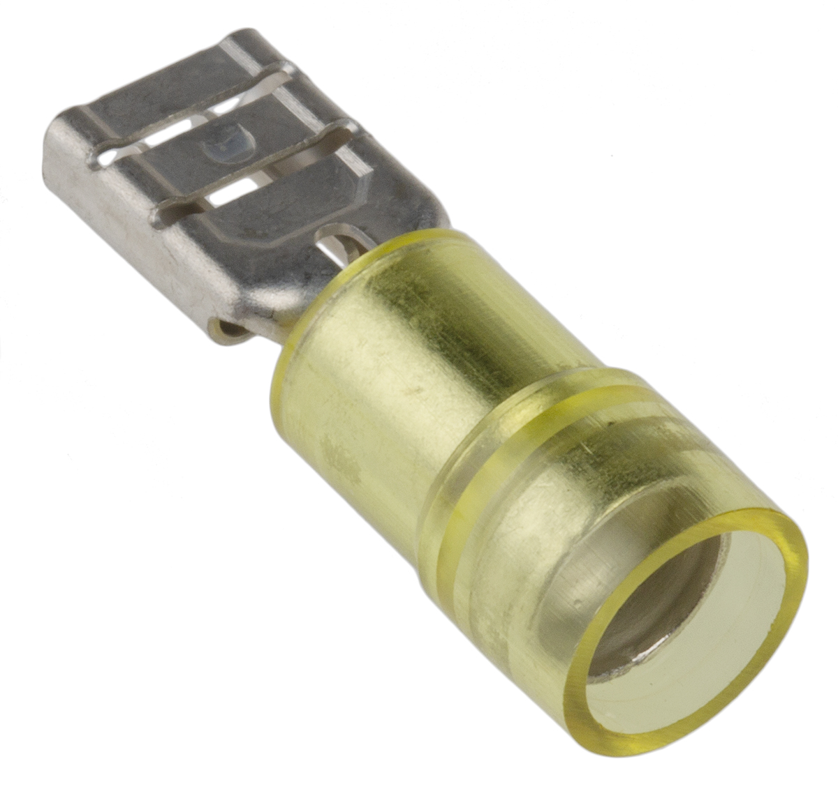 This is PC-INSULATED DOUBLE CRIMP FEMALE DISCONN manufactured by RS PRO. The manufacturer part number is 178-8323. It is supplied as shrouded. The bespoke tab is 0.8mm thick. On the other hand, the wire has 4mm² of minimum size. The tab is 6.35mm wide. The wire has a maximum size of 6mm². In addition, female is the available "Gender" of the product. It has a decent yellow colour. It allows crimp termination method. While the minimum wire size AWG includes 12awg. Its tab size is about 0.8 x 6.35mm . It has a robust pc insulation material. It has an overall length of 23.5mm. Insulation Option: insulated. Its maximum wires size includes 10awg. Concerning wire's size, it is 12 → 10 mm², 4 → 6 mm². It comes in receptacle configuration. The product is made from sturdy brass materials.