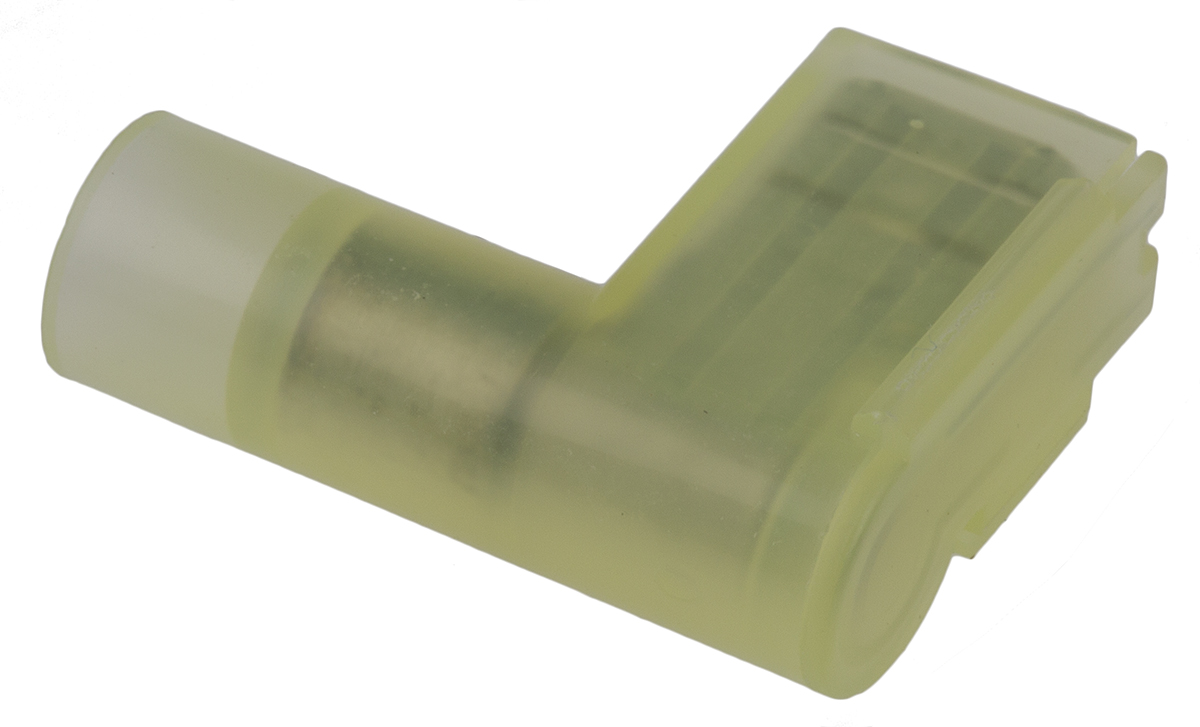 This is NYLON-INSULATED FLAG FEMALE DISCONNECTOR manufactured by RS PRO. The manufacturer part number is 178-8347. The bespoke tab is 0.8mm thick. The tab is 6.35mm wide. The wire has a maximum size of 6mm². In addition, female is the available "Gender" of the product. It has a decent yellow colour. It allows crimp termination method. While the minimum wire size AWG includes 12awg. Its tab size is about 6.35 x 0.8mm . It has a robust nylon insulation material. It has an overall length of 23mm. Insulation Option: insulated. Its maximum wires size includes 10awg. On the other hand, the wire has 4mm² of minimum size. It comes in flag terminal configuration. The product is made from sturdy brass materials.