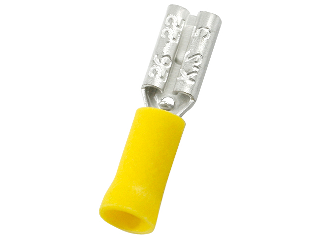 This is Yellow Insulated Female Spade Connector Double Crimp 2.8 x 0.5mm Tab Size 0.2mm² to 0.5mm² manufactured by RS PRO. The manufacturer part number is 270-7567. It is supplied as unshrouded. The bespoke tab is 0.5mm thick. The wire has a maximum size of 0.5mm². The tab is 2.8mm wide. The product has a straight orientation. In addition, female is the available "Gender" of the product. It has a decent yellow colour. It allows crimp termination method. While the minimum wire size AWG includes 26awg. On the other hand, the wire has 0.2mm² of minimum size. Its tab size is about 2.8 x 0.5mm . It has a robust vinyl insulation material. The high-quality tin is used as contact plating material. It has an overall length of 16mm. Insulation Option: insulated. It has a Spade Connector Type of receptacle . Concerning wire's size, it is 0.2 → 0.5 mm², 22 → 26 awg. It comes in double crimp configuration. Its maximum wires size includes 22awg. The product is made from sturdy brass, copper materials.