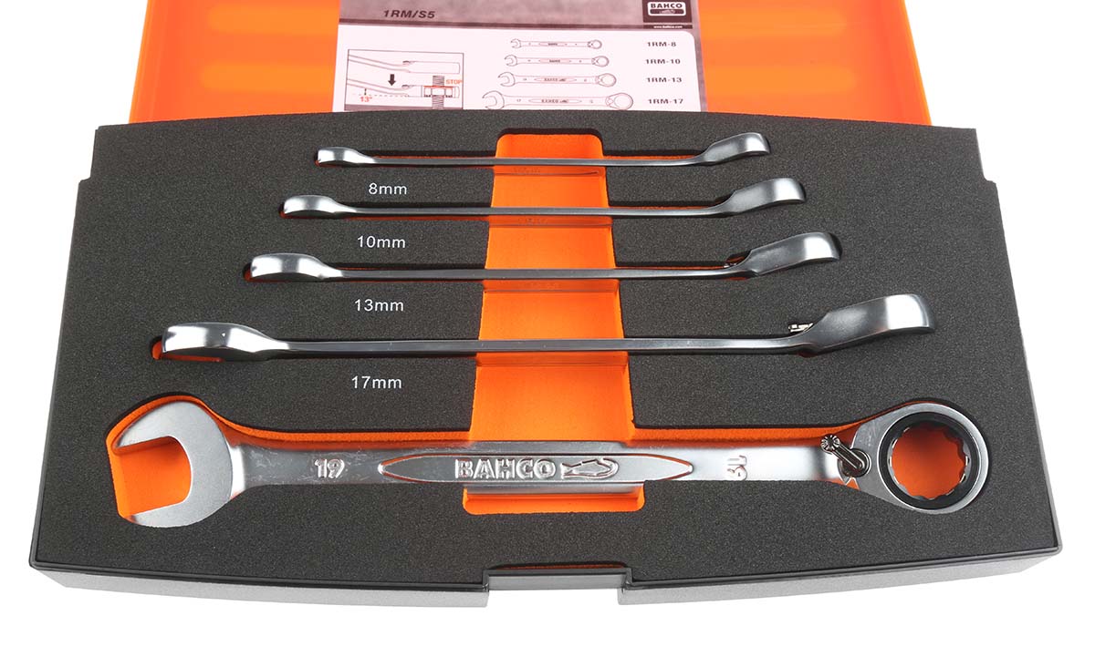 Special Features of Bahco 1RM/S5, 5-Piece Alloy Steel Ratchet Combination Spanner Set, 8 → 19 mm: