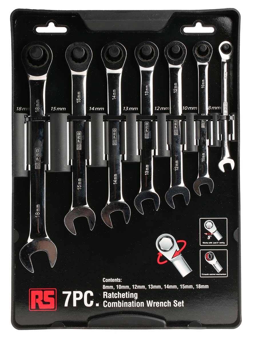 This is 7 Pieces Chrome Vanadium Steel Metric Ratchet Spanner Set manufactured by RS Pro. The manufacturer part number is 487-163. VDE/1000V Approval Options - no. Additionally, it is 8 → 18 mm in set sizes . The product is made from highly stable and reliable chrome vanadium steel. This is a type of combination spanner set, a set with user-desired tools. A quality product with a nice chrome finish. The product consists of 7 pieces.