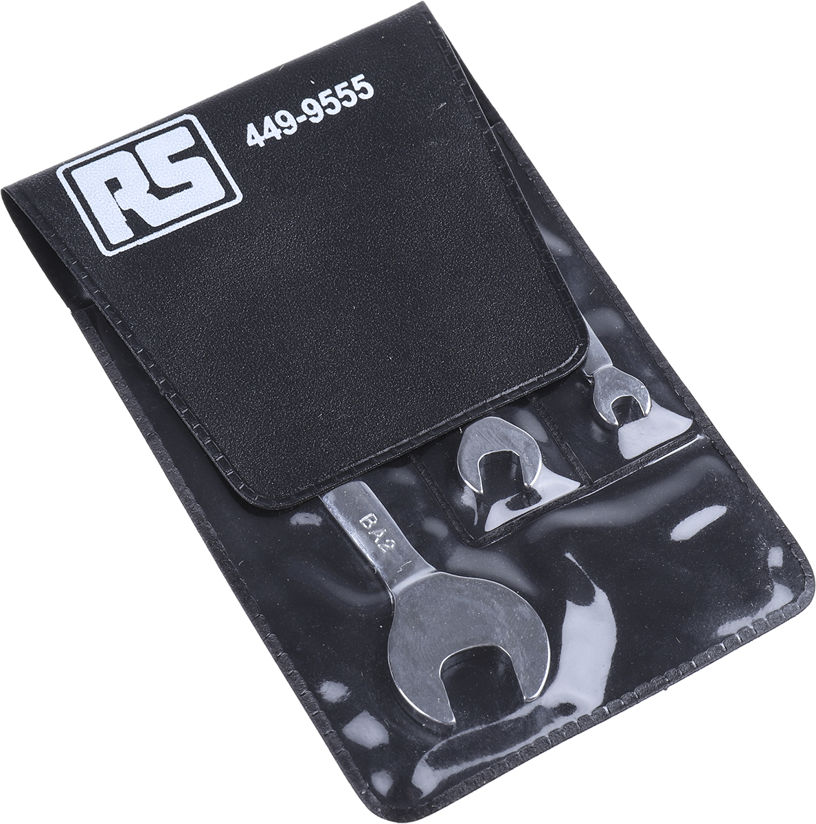 This is 3 Pieces Chrome Vanadium Steel Open Ended Spanner Set manufactured by RS Pro. The manufacturer part number is 449-9555. VDE/1000V Approval Options - no. Additionally, it is ba0 x ba2, ba4 x ba6, ba8 x ba10 in set sizes . The product is made from highly stable and reliable chrome vanadium steel. This is a type of open ended spanner set, a set with user-desired tools. A quality product with a nice chrome finish. The product consists of 3 pieces.