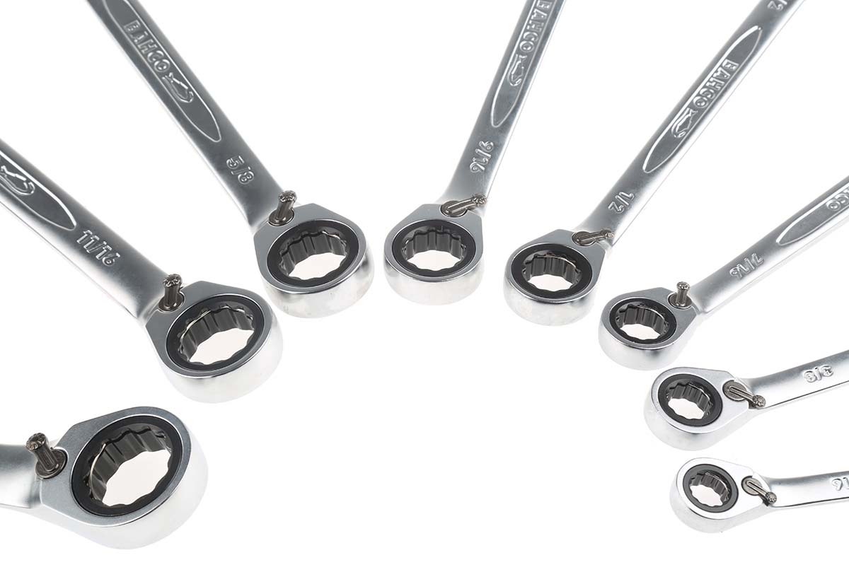 The Bahco 1RZ/SH8, 8-piece Alloy Steel Combination Ratchet Spanner Set, ranging from 5/16 to 3/4 mm, housed in a convenient plastic carry holder, epitomizes precision and versatility in mechanical toolsets. Crafted from premium alloy steel, each spanner boasts a combination of durability, strength, and corrosion resistance, ensuring longevity in demanding work environments. The ratchet mechanism facilitates swift direction changes, enabling seamless tightening or loosening of fasteners with minimal effort. With a compact design and an ergonomic grip, these spanners offer enhanced manoeuvrability and comfort during prolonged use.