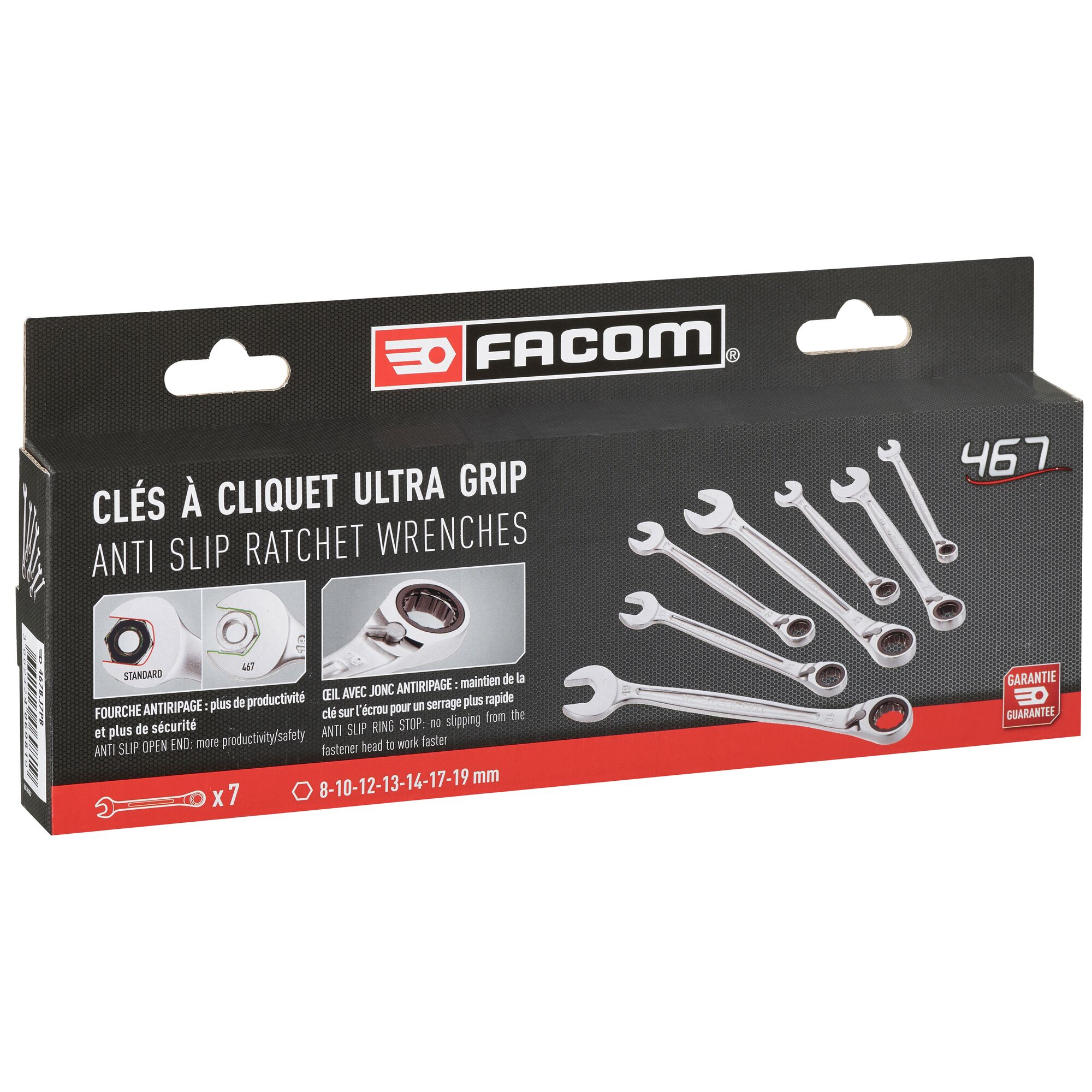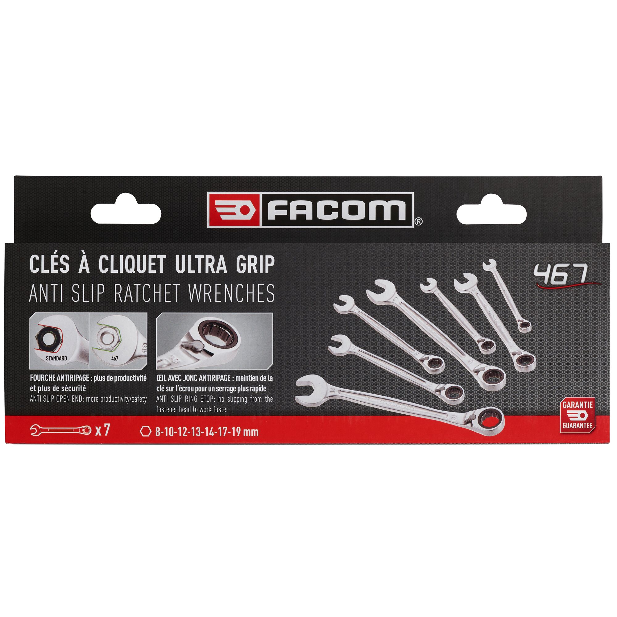 This is 7 Pieces Metric Ratchet Spanner Set manufactured by Facom. The manufacturer part number is 467B.J7PB. This is a type of reversible ratchet wrench set, a set with user-desired tools. The product 467b.j7pb, is a highly preferred choice for users. Additionally, it is 8 → 19 mm in set sizes . The product consists of 7 pieces. Ratcheting Options - yes.