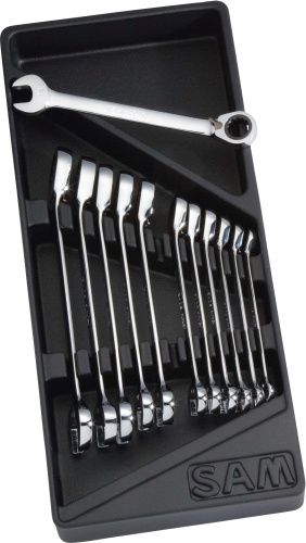 This is 12 Piece Combination Ratchet Spanner Set manufactured by SAM. The manufacturer part number is 50-C-J12M. This is a type of combination ratchet spanner set, a set with user-desired tools. VDE/1000V Approval Options - no. Additionally, it is 8 → 19 mm in set sizes . The product consists of 12 pieces.
