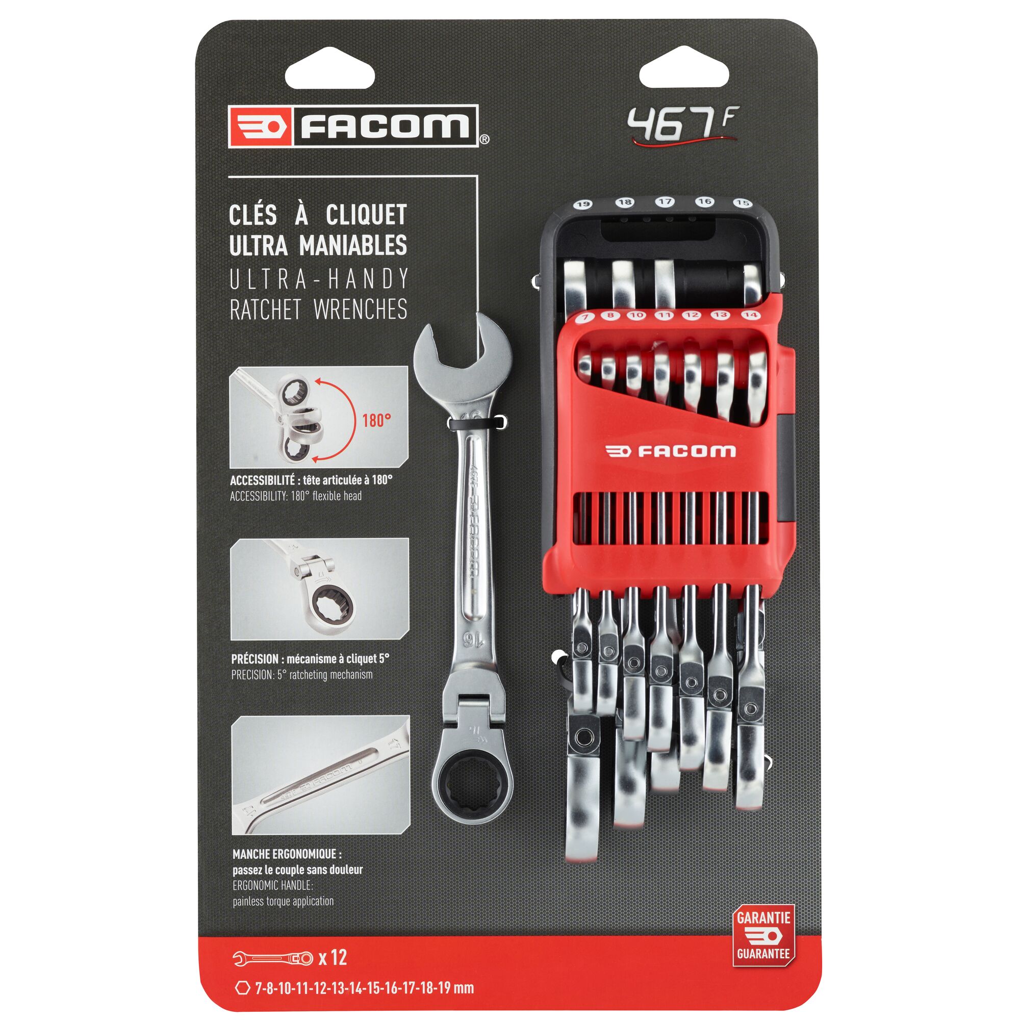This is 12 Piece Spanner Set manufactured by Facom. The manufacturer part number is 467BF.JP12PB. This is a type of ratchet wrenches, a set with user-desired tools. The product 467bf, is a highly preferred choice for users. VDE/1000V Approval Options - no. Additionally, it is 7 → 19 mm in set sizes . The product consists of 12 pieces.