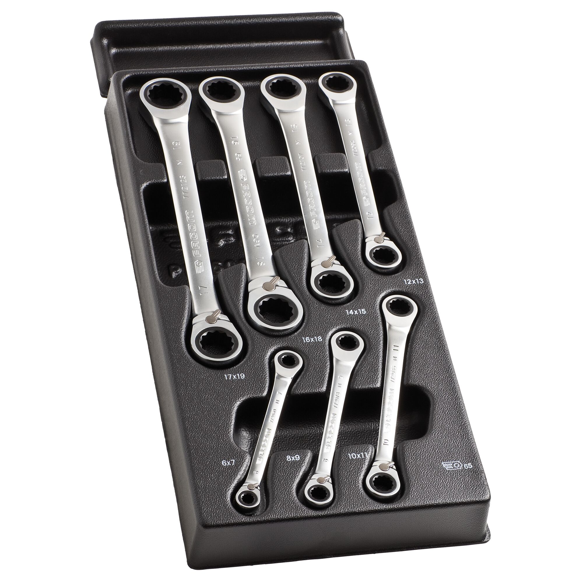 This is 7 Piece Chrome Ring Spanner Set manufactured by Facom. The manufacturer part number is MOD.65J7PB. Additionally, it is 6 in, 7 in, 8 in, 9 in, 10 in, 11 in, 12 in, 13 in, 14 in, 15 in, 16 in, 17 in, 18 in, 19 in in set sizes . The product 65 series ratchet polygon wrenches, is a highly preferred choice for users. The product is made from highly stable and reliable chrome. This is a type of ring spanner-set, a set with user-desired tools. The product consists of 7 pieces.