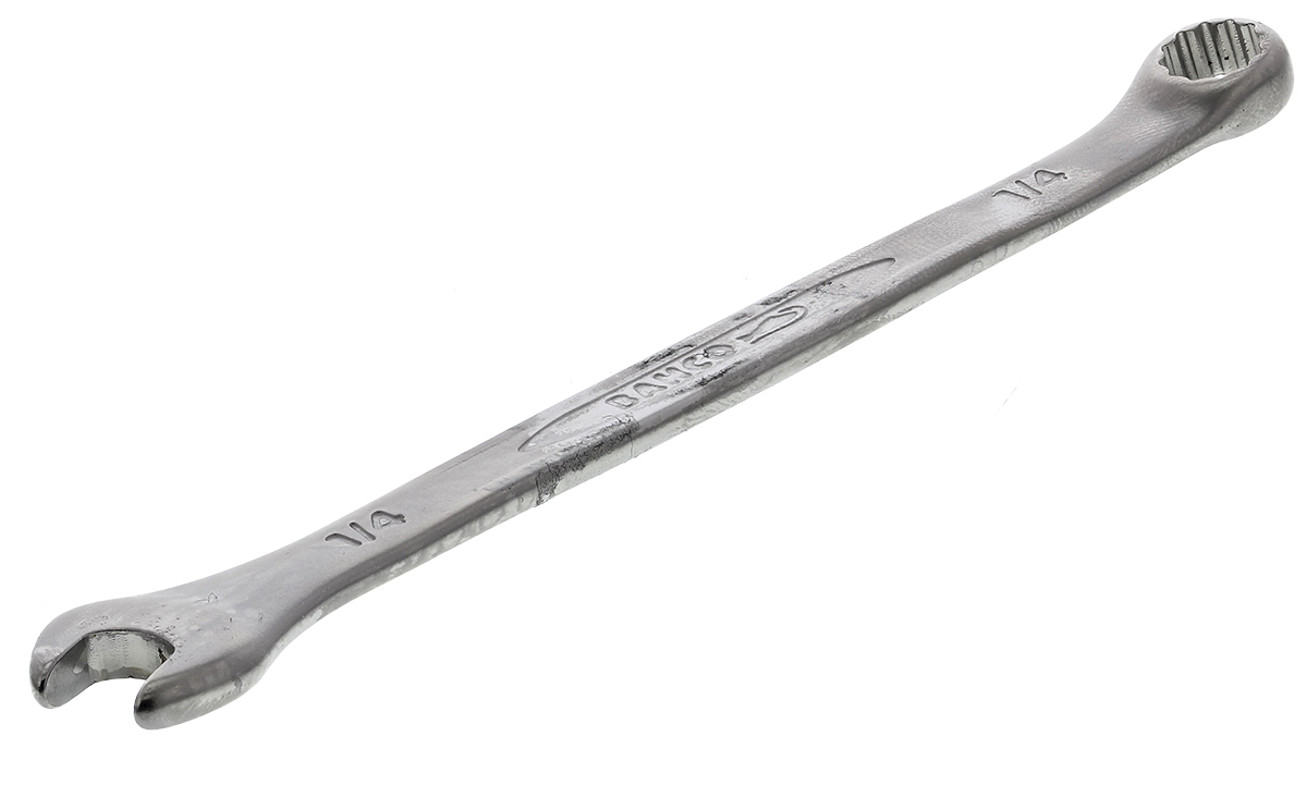 The Bahco 111Z-1/4 is a precision-crafted combination spanner designed to offer exceptional versatility and durability for a wide array of fastening tasks. Measuring 112mm in overall length, this 1/4" imperial spanner is engineered from high-performance alloy steel, which ensures both longevity and optimum strength. Its slim head profile allows for easy access in confined spaces, while the 12-point Dynamic-Drive profile on the ring end virtually eliminates the risk of damaging the corners of fasteners. This tool uniquely combines an open end and a ring end, offering the convenience of two tools in one.