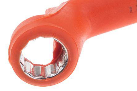 This is 9/16 in Insulated Offset Ring Spanner 217 mm length manufactured by RS Pro. The manufacturer part number is 911-1297. VDE/1000V Approval Options - yes. A quality product with a nice insulated finish. Furthermore, it has a/an ring spanner type spanner . The product is made from highly stable and reliable chrome vanadium steel. It has an overall length of 217 mm. In addition, it has about 9/16in imperial size . It has an offset feature included yes . It is double ended no . The product is available in 9/16 in size.