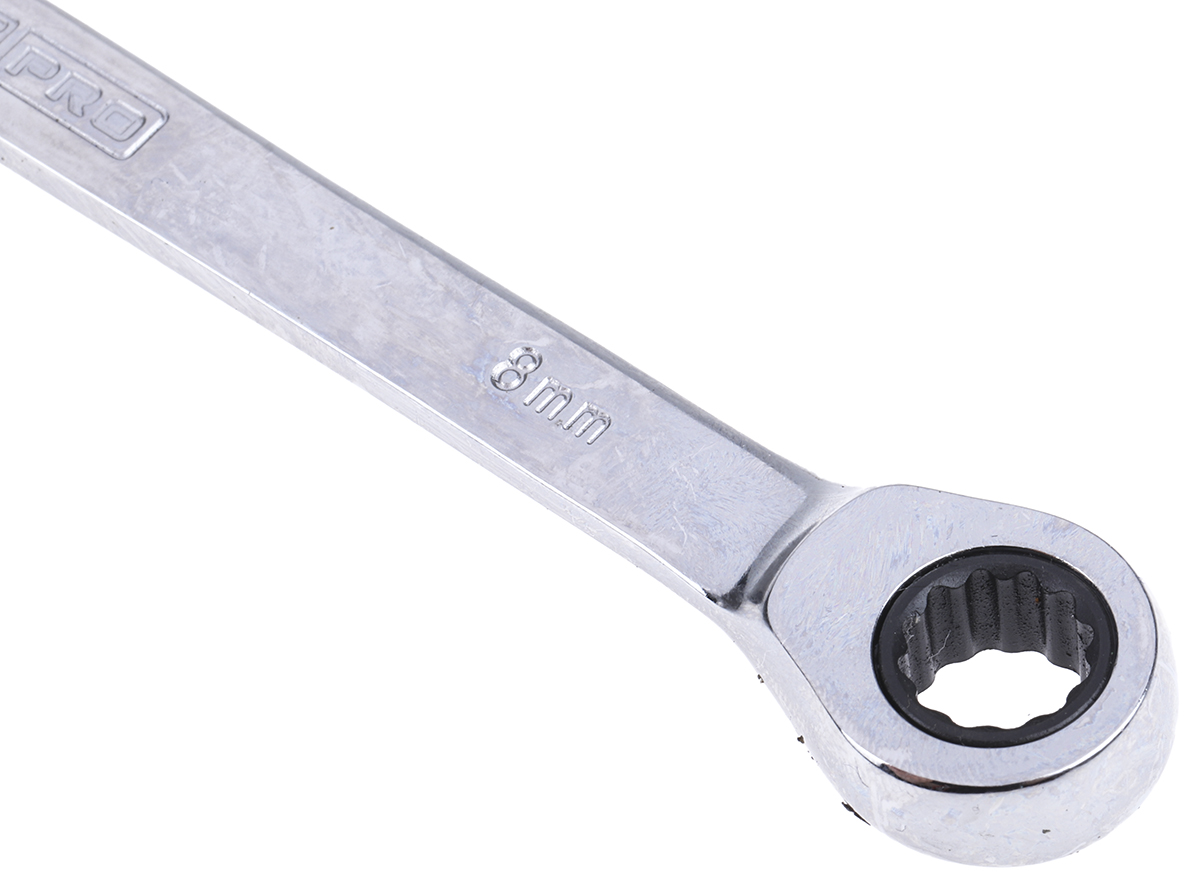 This is 8 mm Combination Ratchet Spanner 136 mm Length manufactured by RS Pro. The manufacturer part number is 487-208. It is available in metric package. A quality product with a nice chrome finish. Furthermore, it has a/an combination ratchet spanner type spanner . The product is made from highly stable and reliable chrome vanadium steel. It is double ended yes . Its metric size is approximately 8mm . The product is available in 8 mm size.