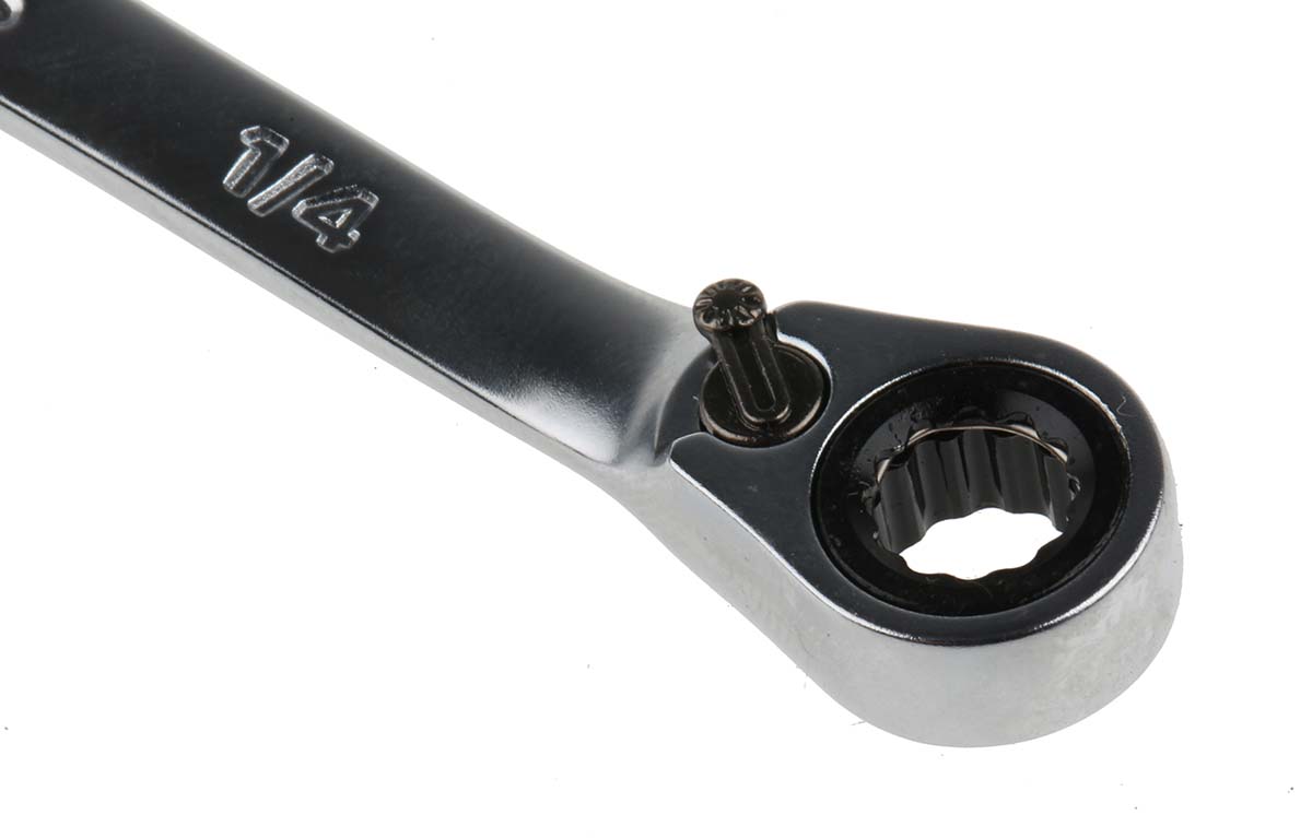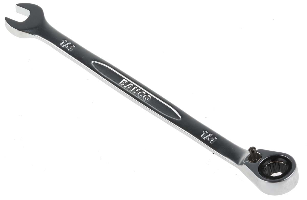 The Bahco 1RZ-1/4 is a meticulously designed 1/4" imperial combination ratchet spanner that embodies precision engineering and versatility. Crafted with a durable chrome finish, this tool measures 128mm in overall length, ensuring it is both compact and robust for various tasks. Its design integrates a combination of a fixed spanner on one end and a ratcheting mechanism on the other, offering users the flexibility to work in tight spaces where movement is restricted. The ratchet mechanism facilitates ease of use, allowing for faster tightening or loosening of fasteners without the need to lift the tool from the fastener, enhancing productivity and efficiency.